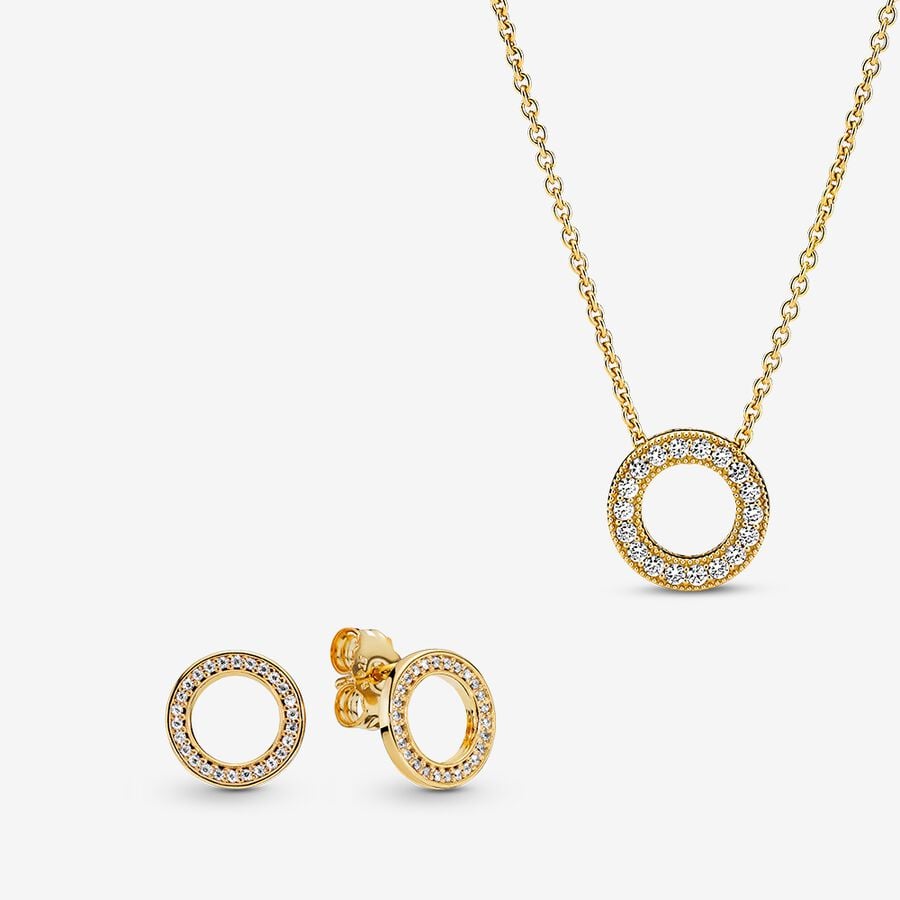 אם אתם מחפשים מתנה קלאסית, נוצצת ועל זמנית טבעת ושרשרת אלגנטיות כפולה יהיו בחירה מפנקת לאישה שאוהבים. התכשיטים מקושטים באבני זירקון שקופות, ובלב כל תכשיט ישנה אבן מרכזית שמוקפת בשתי הילות מנצנצות.