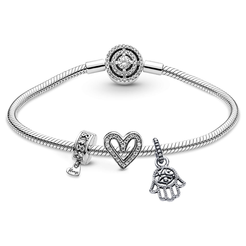 צמידי הקונספט של פנדורה הם המתנה המושלמת לכל רגע בחיים. צמיד קונספט כסף עם סוגר לב כולל סוגר לב מפנדורה רוז ובו שיבוץ פאווה של זירקונים נוצצים. זוהי מתנה שמדברת אהבה, בעזרת כל הפרטים הקטנים, שמסמלים את קשר האחיות המיוחד שלכם, ואת האהבה הבסיסית שיש ביניכן. כמובן שאפשר לשלב צ'ארמס סמליים ומשמעותיים עבורכן, ולהלביש על הצמיד.