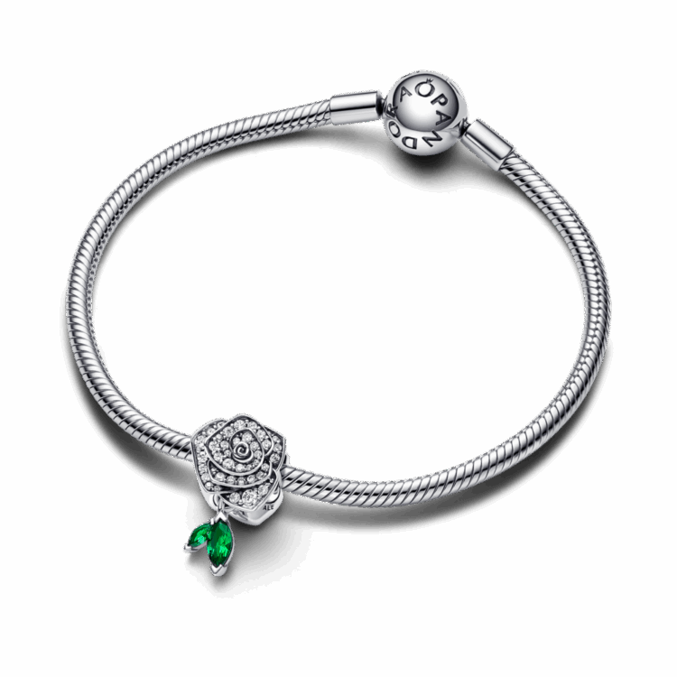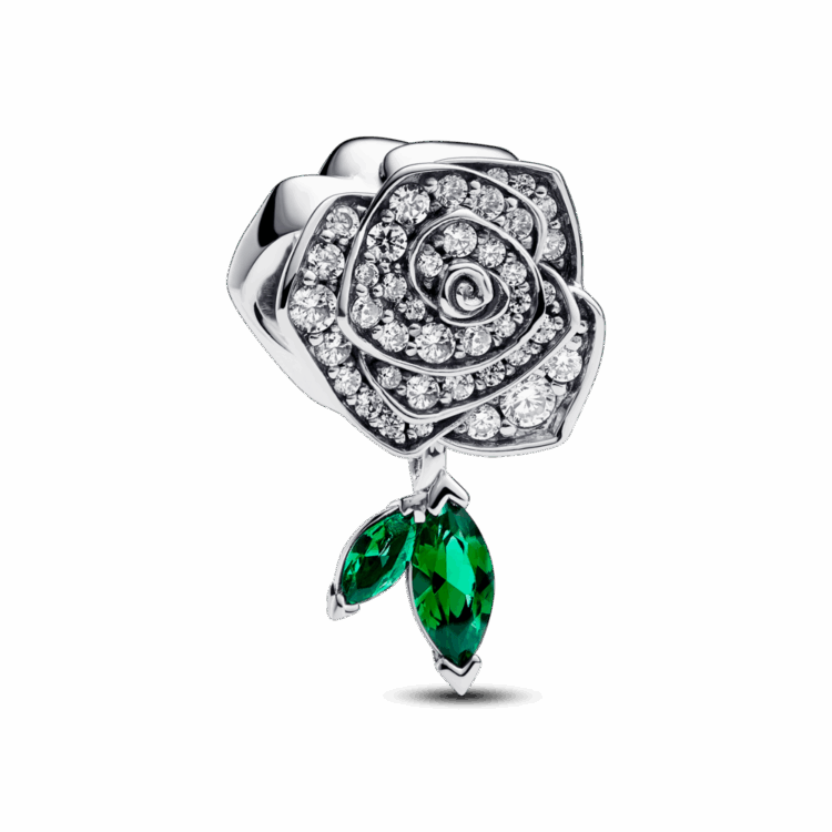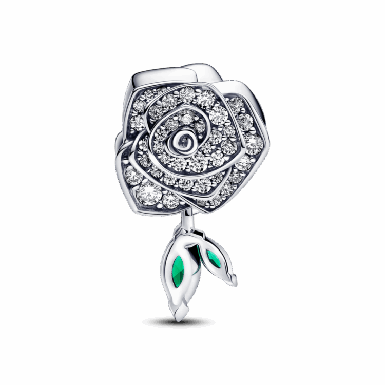 אלגנטיות פורחת: צארמ כסף סטרלינג בצורת ורד מנצנץ שתמיד ישמור על הרומנטיקה. מעוצב עם עלי כותרת באפקט שכבות בתוספת שיבוץ פאווה ועלים מאבנים ירוקות. הוא יהיה מושלם כמחוות אהבה למישהו קרוב או כתוספת משמעותית לקולקציית המומנטס שלך.