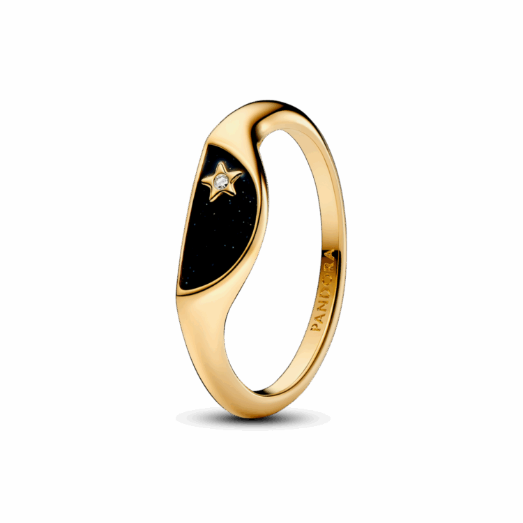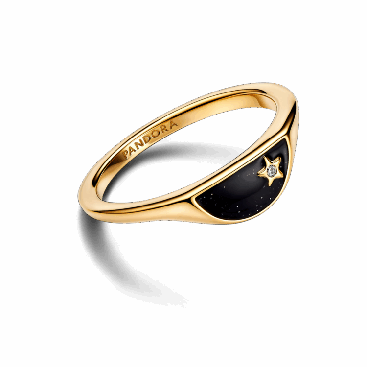 טבעת בציפוי זהב 14 קראט מקולקציית Pandora Me, הכוללת חצי עיגול בצבע אמייל שחור נוצץ עם כוכב מוגבה בשילוב אבן נוצצת. ענדי אותה לבד או שלבי אותה עם הטבעת התואמת בכסף סטרלינג והציבי את הכוכבים זה מול זה.