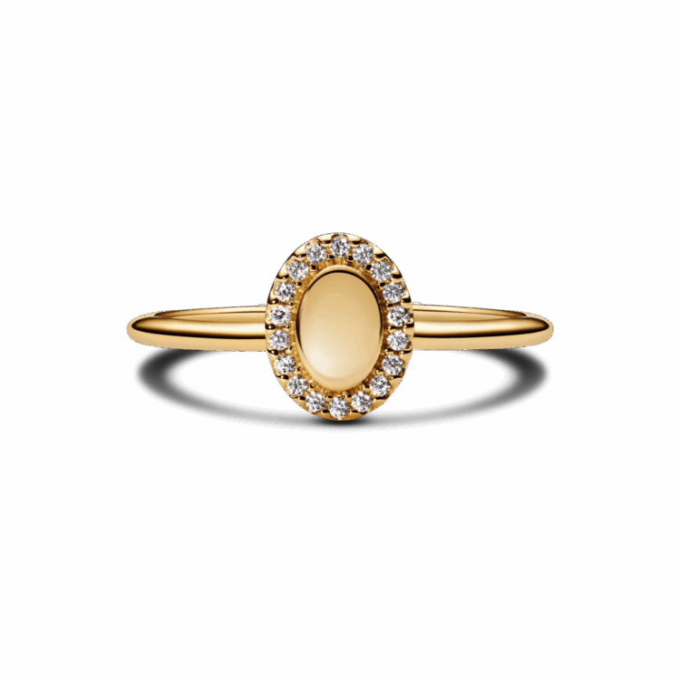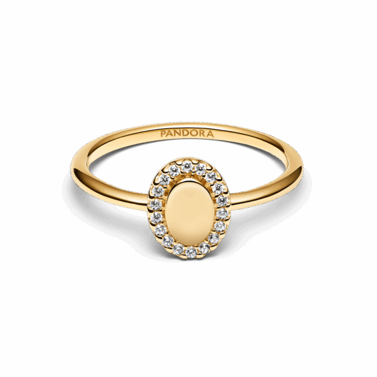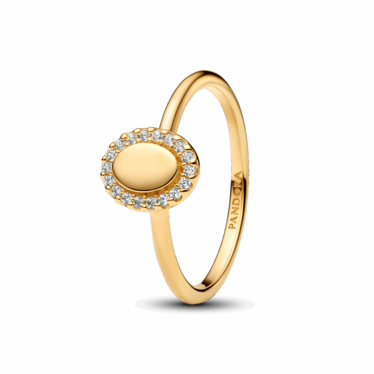 טבעת בציפוי זהב 14 קראט עם אליפסה במרכז המוקפת בזרקונים נוצצים בשיבוץ פאווה