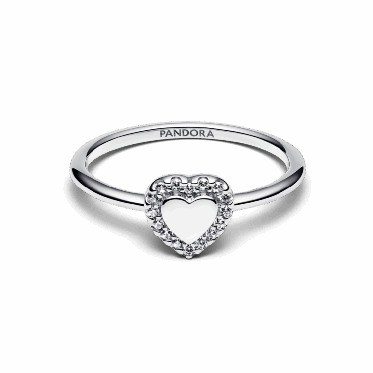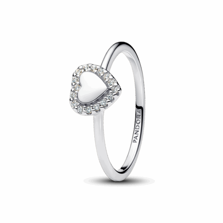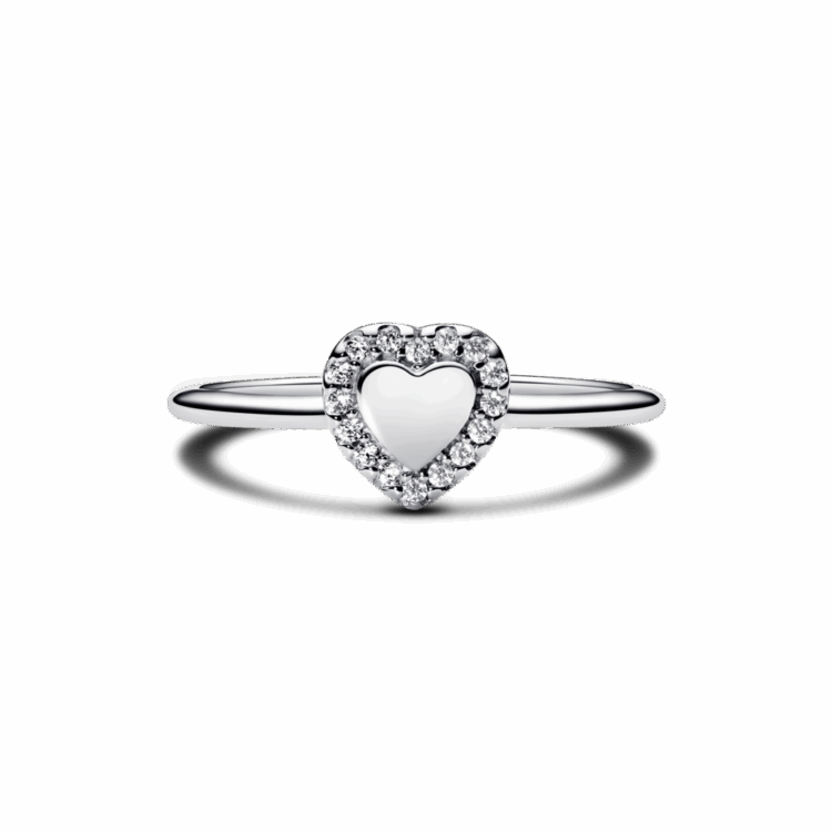 טבעת כסף סטרלינג עם לב במרכז המוקף בזרקונים נוצצים בשיבוץ פאווה