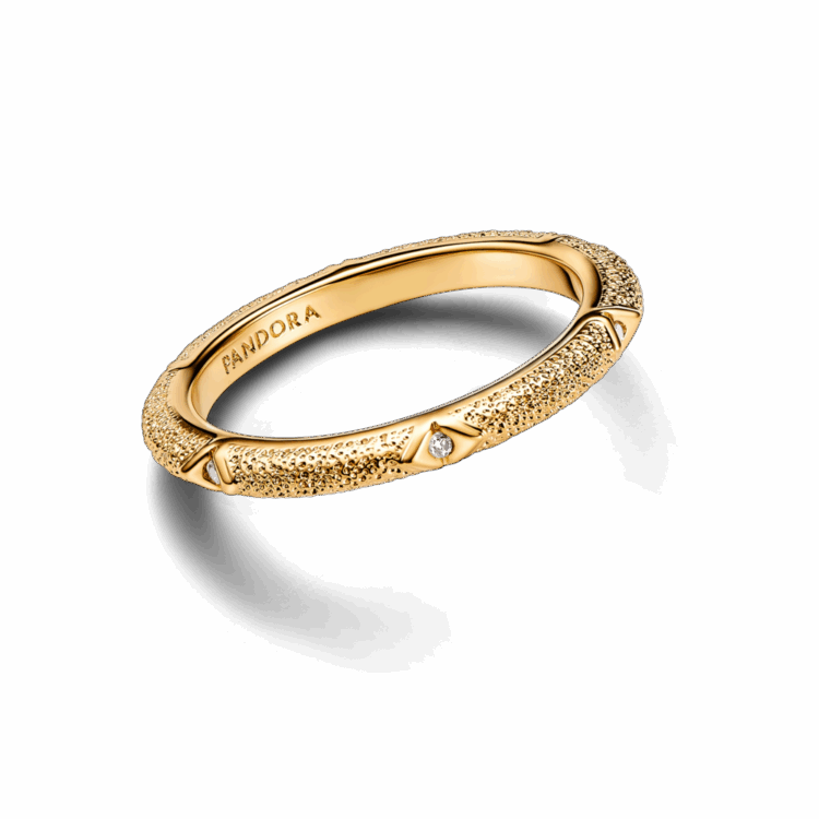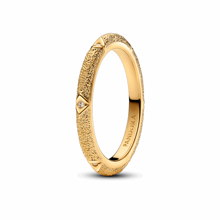זה הכל בדיטיילז: טבעת בציפוי זהב 14 קראט ובטקסטורה ייחודית מקולקציית Pandora Me. מעוצבת בצורת פירמידה עם שישה אבנים קטנות, שאר הטבעת מעוטרת בדוגמת מרקם. בהשראת מראת החול והשמש הנוצצת על האוקיינוס, הטבעת העדינה הזו מלאה בסטייטמנט.
