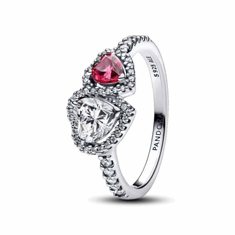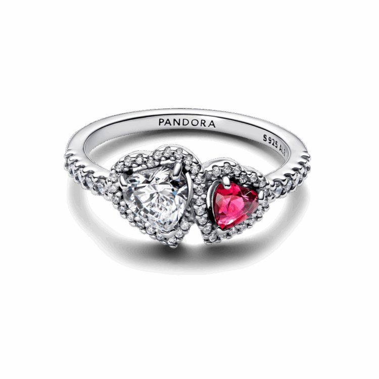 טבעת כסף סטרלינג עם שתי אבנים בצורת לב, אחת מהן עשויה זרקון שקוף והשנייה קריסטל אדום מלא חיים. הלבבות מחוברים באבנים קטנות ונוצצות היוצרות אפקט זוהר. שני הלבבות מסמלים הרמוניה בהשראת האהבה המחברת ביניהם. שלבי אותה עם טבעות כסף אחרות וצרי לוק שכבות מלא באהבה, או תני לה לזרוח לבדה.
