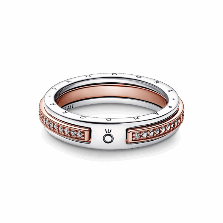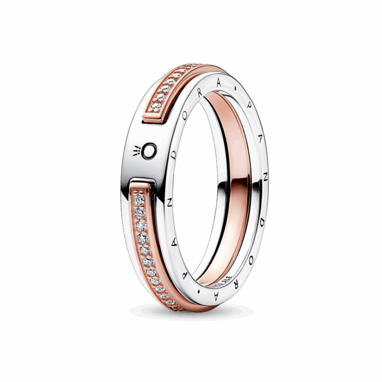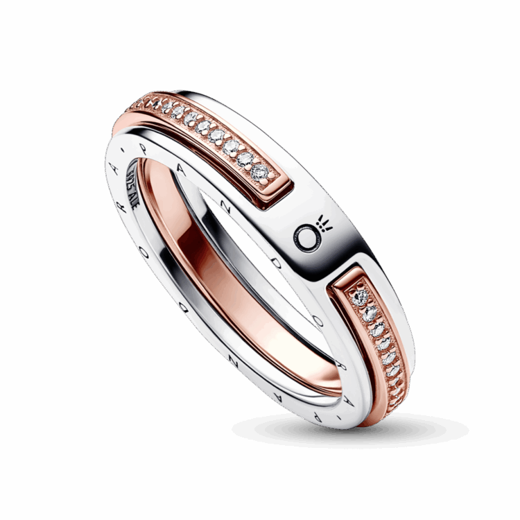 בני את ערימת הטבעות שלך עם טבעת פאווה קולור-בלוק מקולקציית Pandora Signature, עם רצועת פרופיל מרובעת בשילוב שני גוונים, לטבעת זו יש עיצוב מצופה זהב ורדרד 14 קראט מוגבה מעט העובר כמעט מסביב עם נצנוץ במרכזה. בחלק האחורי של הטבעת חרוט כתר Pandora O, היוצר פער קטן ברצועת הזהב הורוד. הטבעת ההצהרתית הזו היא בגדר חובה בכל קולקציית תכשיטים, בולטת בפני עצמה או במראה שכבות.