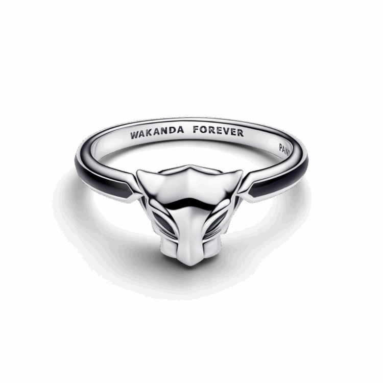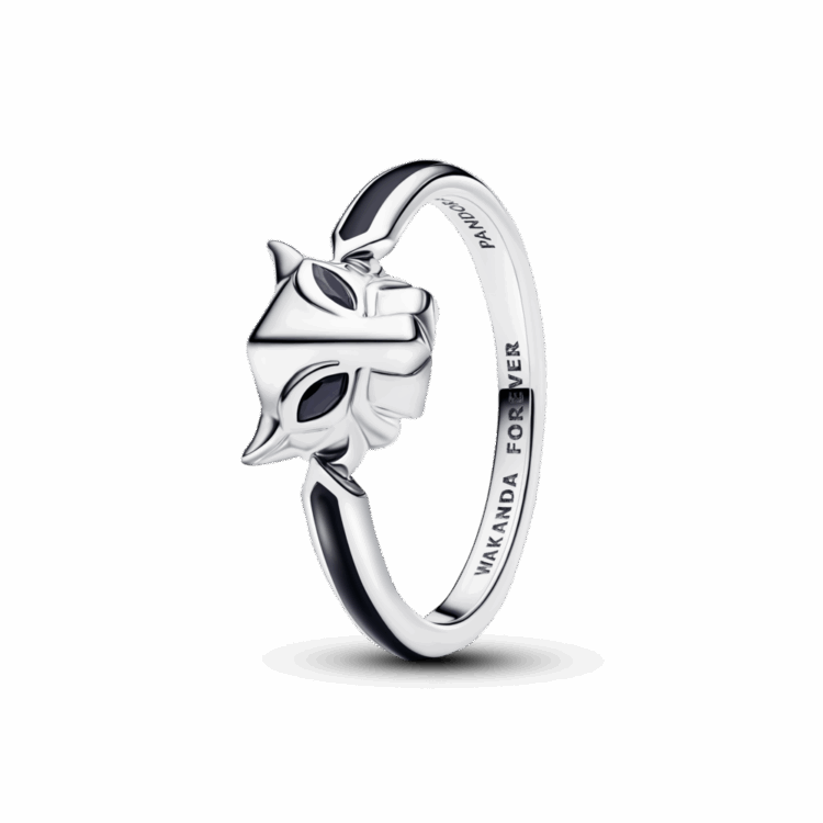 טבעת כסף סטרלינג של מארוול בהשראת Black Panther, עם קריסטל שחור עמוק ואמייל שחור מדויק. עוצמה שקטה ואלגנטיות אפלה.