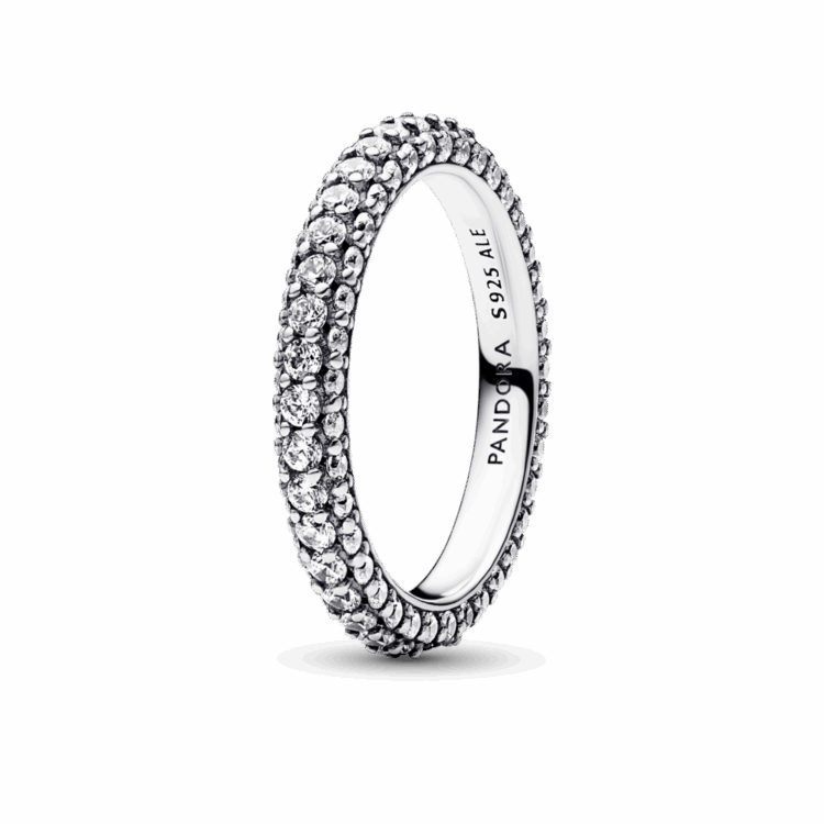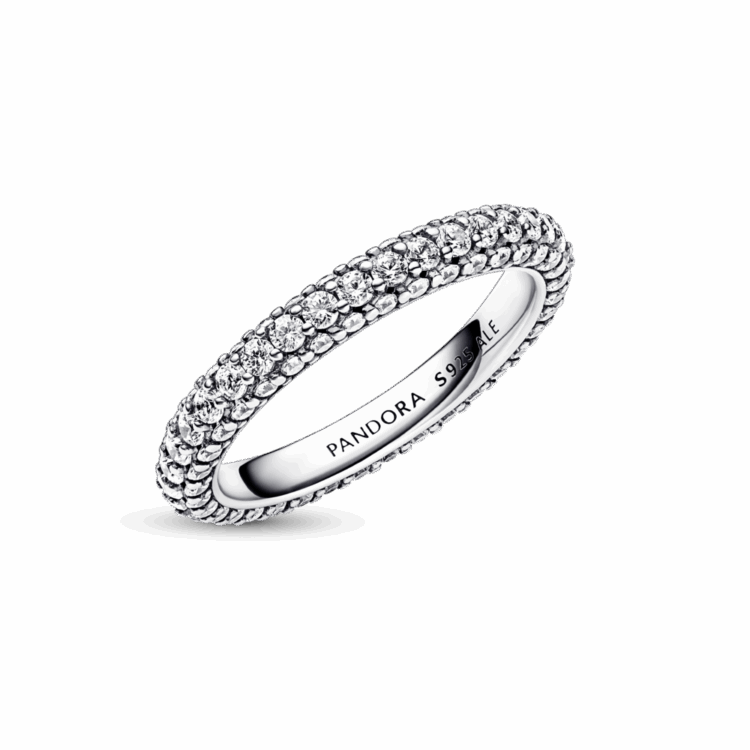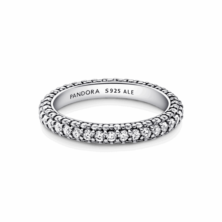 ניתן להערמה, זוהרת, נצחית טבעת שורה-יחידה של פאווה מקולקציית Pandora Timeless, המעוצבת בכסף סטרלינג בגימור עבודת יד וכוללת שורה אחת של זירקוניה קובית שקופה סביב המרכז ושורה אחת הפונה כלפי חוץ סביב כל צד, באופן היוצר פרופיל מרובע אך מעוגל מעט שנוצץ מכל זווית שמסתכלים עליו. סגנני אותה בפני עצמה או עם פריטי פאווה אחרים מקולקציית Timeless כדי ליצור אפקט מינימליסטי או מקסימליסטי כרצונך.