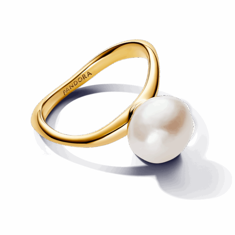 סוג חדש של קלאסיקה: טבעת בציפוי זהב 14 קראט בעובי משתנה עם פנינת בארוק גדולה בצורה מעט גלית. הפנינה מתורבתת ונוצרה במעבדה במים מתוקים, כל פנינה היא ייחודית ויכולה להיות שונה בגודלה ובצבעה.