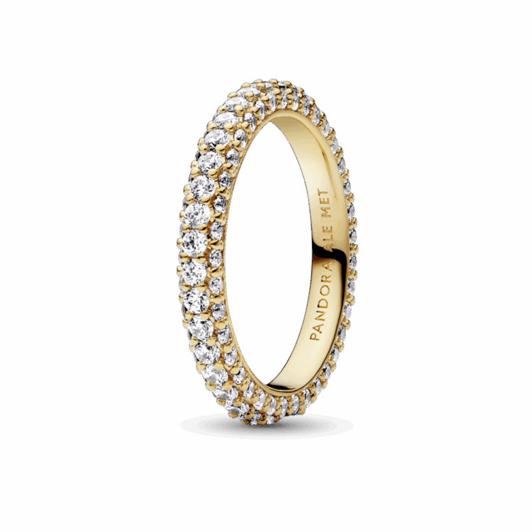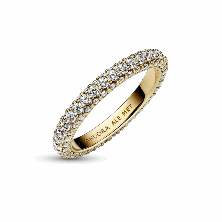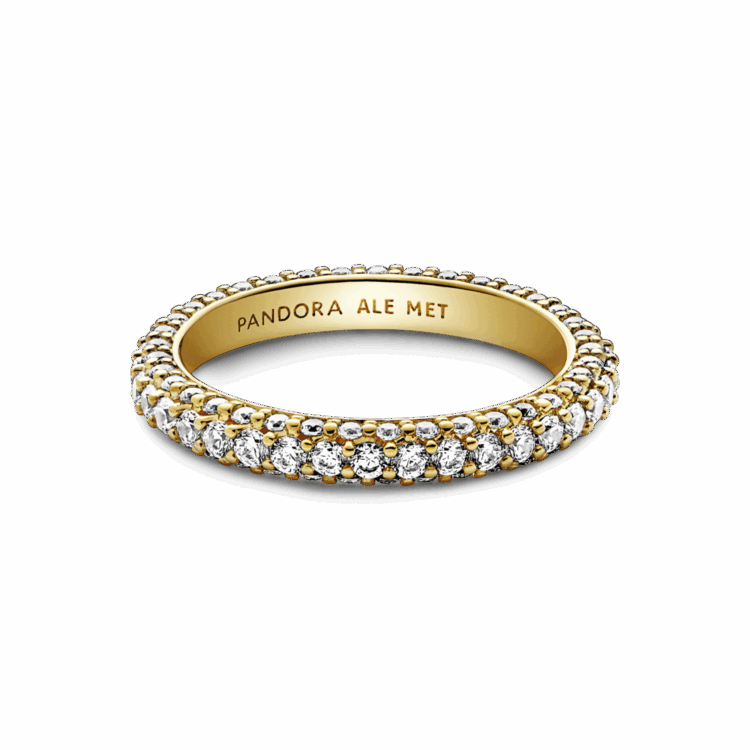 ניתן להערמה, זוהרת, נצחית טבעת שורה-יחידה של פאווה מקולקציית Pandora Timeless. זוהרת בציפוי זהב 14 קאראט, בגימור עבודת יד וכוללת שורה אחת של זירקוניה קובית שקופה סביב המרכז ושורה אחת הפונה כלפי חוץ סביב כל צד באופן היוצר פרופיל מרובע אך מעוגל מעט, שנוצץ מכל זווית שמסתכלים עליו. סגנני אותה בפני עצמה או עם פריטי פאווה אחרים מקולקציית Timeless כדי ליצור אפקט מינימליסטי או מקסימליסטי כרצונך.