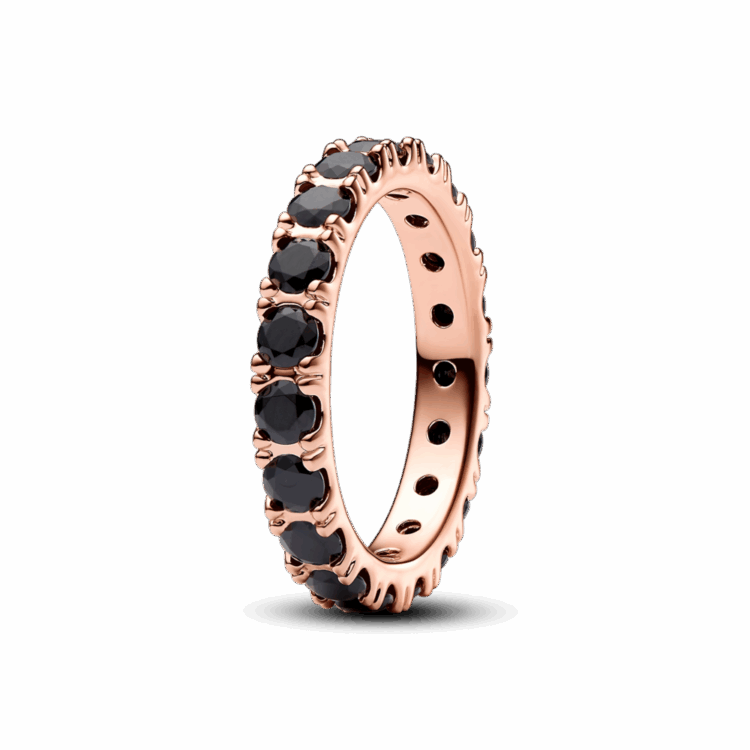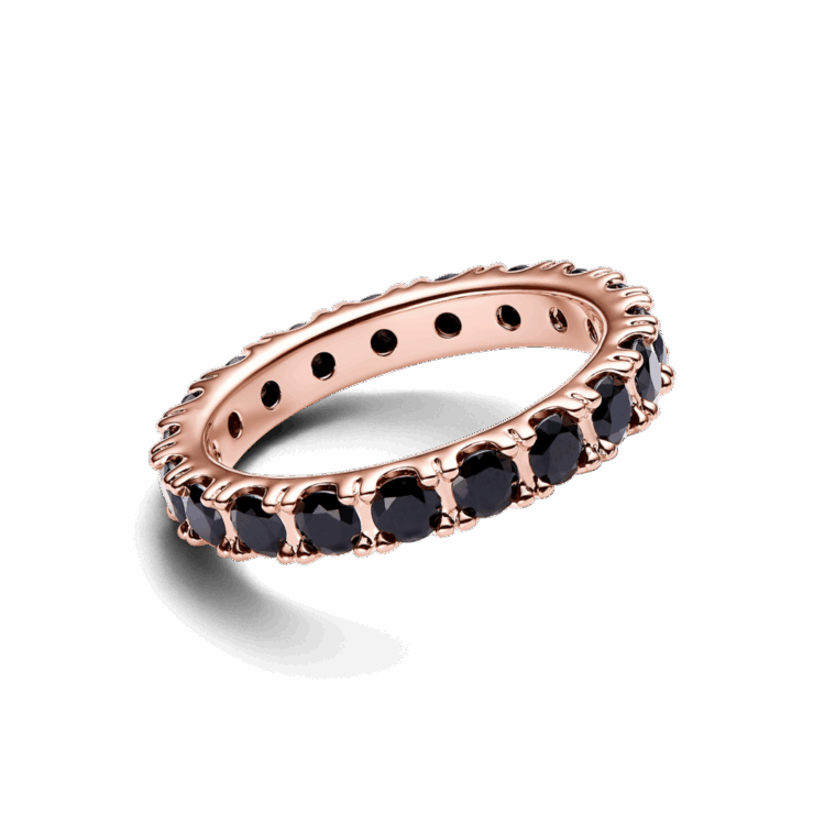 אלגנטיות נצחית עם טוויסט: טבעת בציפוי זהב ורוד 14 קראט עם 19 אבני קריסטל שחורות בעבודת יד. עיצוב האיטרניטי מאפשר להציץ בין דפנות האבנים ומציע טוויסט מודרני. לכי על מראה שכבות טרנדי או תני לה לנצנץ לבדה.