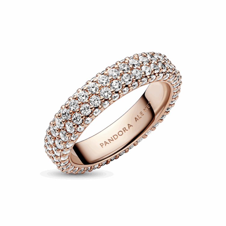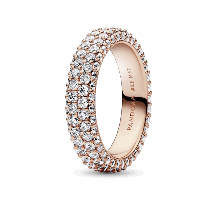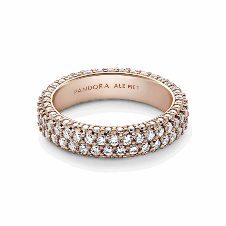 העצימי את הזוהר שלך למקסימום עם טבעת שורה-כפולה פאווה מקולקציית Pandora Timeless. טבעת שורה-יחידה של פאווה עם ציפוי זהב רוז 14 קאראט בגימור עבודת יד כוללת שתי שורות של זירקוניה קובית שקופה סביב המרכז ושורה אחת הפונה כלפי חוץ סביב כל צד באופן היוצר פרופיל מרובע אך מעוגל מעט שנוצץ מכל זווית שמסתכלים עליו. ענדי אותה בפני עצמה או מוערמת עם טבעות אחרות מקולקציית Timeless כדי ליצור לוק נועז ככל שתרצי.