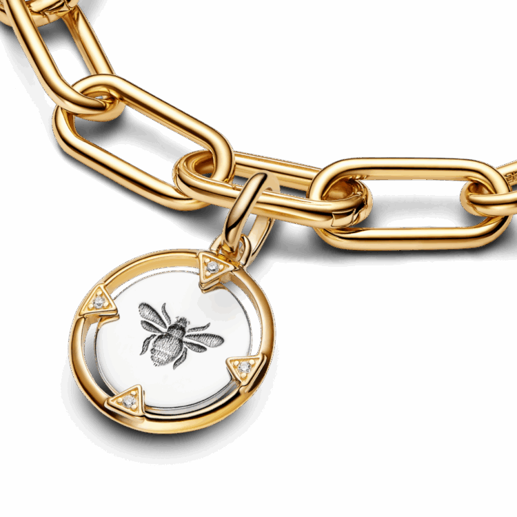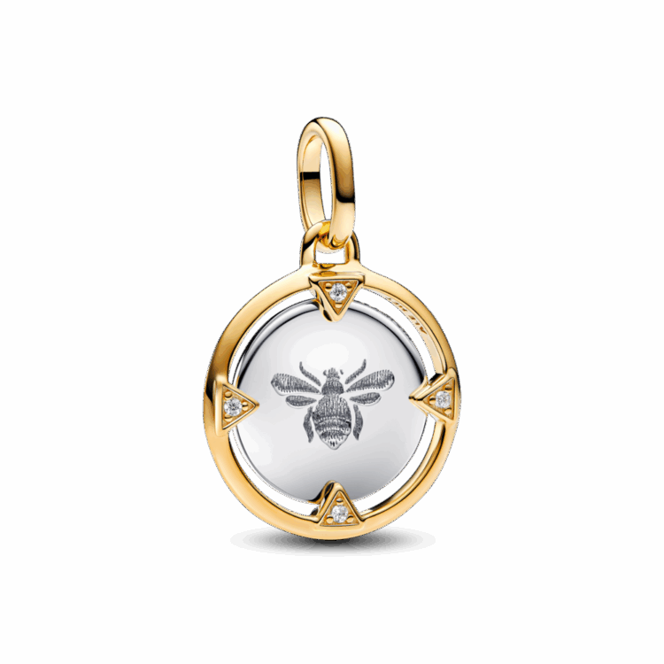 מדליון עשוי כסף סטרלינג וציפוי זהב 14 קראט מקולקציית Pandora ME. צד אחד כולל דבורה מוטבעת עם ארבעה משולשים משובצים בזרקונים, ובצד השני מופיע הכיתוב Protect your energy. הוסיפי אותו לאוסף הצארמס שלך כדי לסמל שהחיים הם עבודה משמעותית, חיוביות ואיזון.