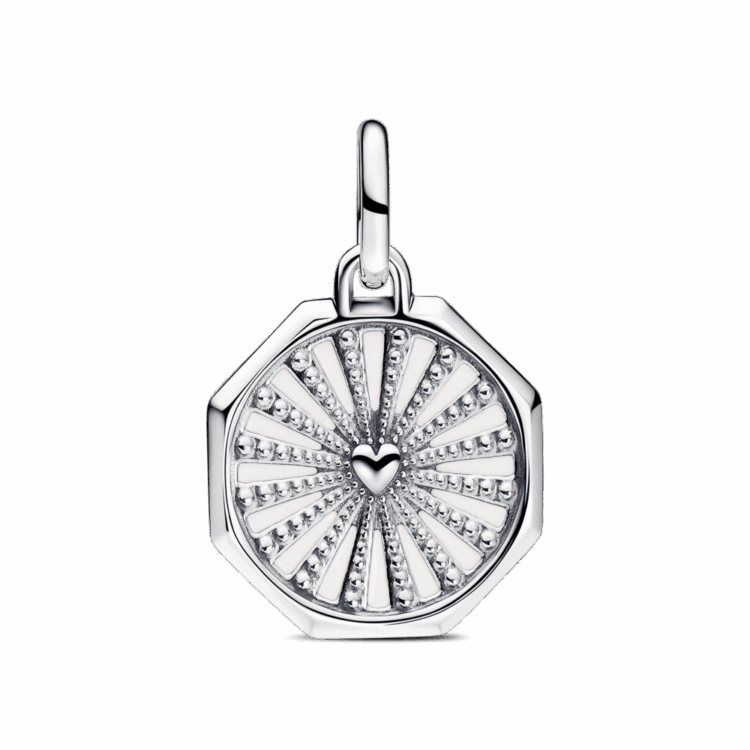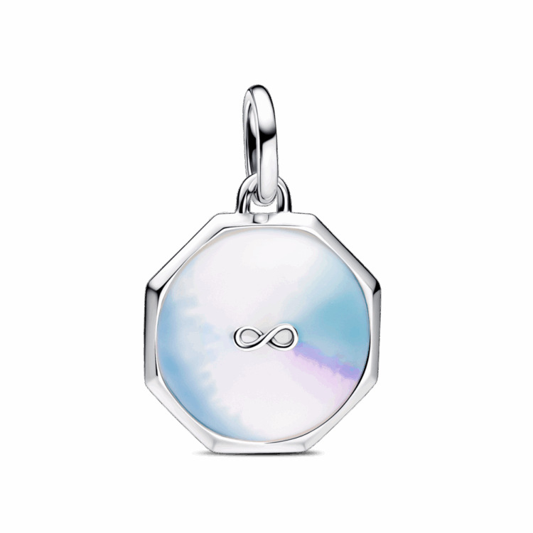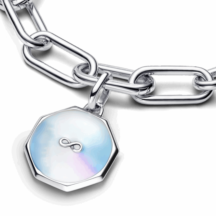 עם מדליון אינפיניטי מקולקציית Pandora Me, האפשרויות הן אינסופיות. עשוי כסף סטרלינג בצורת מתומן, מוקף אמייל צבעוני בהשראת טאי-דאי. בצד ההפוך, קרניים חתוכות עם פרטי מיקרו-חרוזים מקיפות לב בולט במרכז. ערמי אותו עם סמלים נוספים בשביל למקסם את המשמעות האישית, או ענדי אותו לבד ותראי איך הוא ימשוך את כל תשומת הלב. יתאים רק לחוליות הניתנות לפתיחה.
