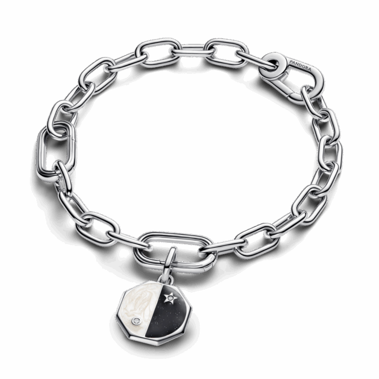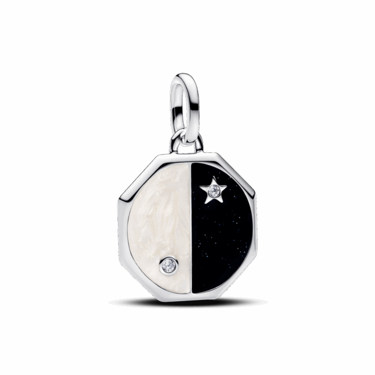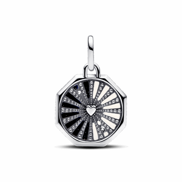הפכים נמשכים: מדליון כסף סטרלינג בעיצוב גיאומטרי עם צבע אמייל שחור ולבן ואבנים משובצות המסמלות את מחזורי היום והלילה. הצד השני כולל קרני שמש חתוכות המקיפות לב מרכזי עם חרוזים קטנטנים. ענדי את התכשיט הזה כתזכורת לכך שיש איזון והרמוניה ביקום.