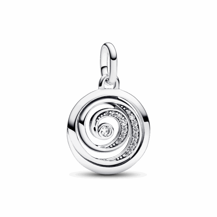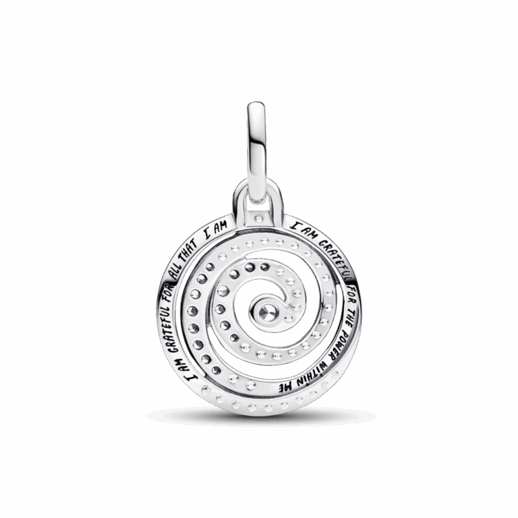 יש רק אווירה טובה כשעונדים את מדליון הספירלה שכולה הכרת תודה, מקולקציית Pandora ME. הצארמ עשוי כסף סטרלינג וכולל אבנים נוצצות ואלמנטים עיצוביים הכוללים קווי מתאר בצורת מנסרה, דיטיילז חתוכים וקו שעליו חרוט I am grateful for all that I am, I am grateful for the power within me. שלבי את המדליון עם הלינק האהוב עלייך כסמל וחגיגה של מודעות עצמית, אהבה עצמית וביטוי עצמי. מתאים גם לקולקציית Pandora Moments וגם ל-Pandora ME.