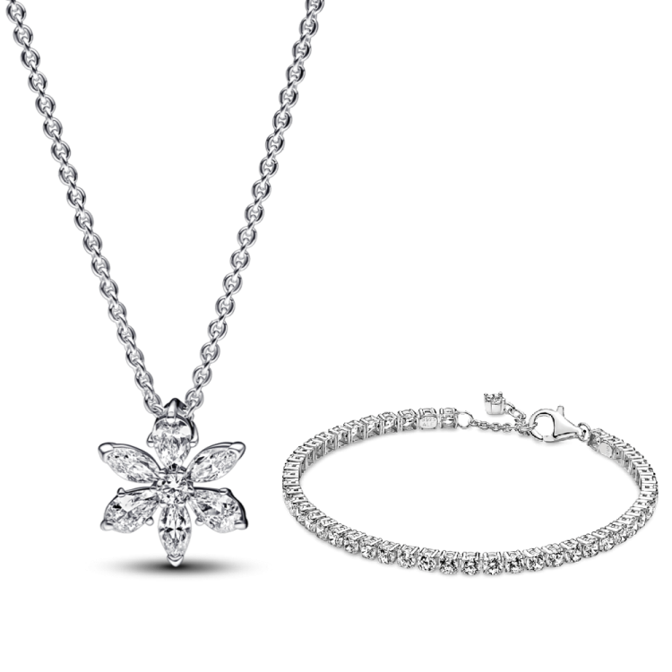 סט שרשרת כסף שייני פלאוור וצמיד טניס מרובע