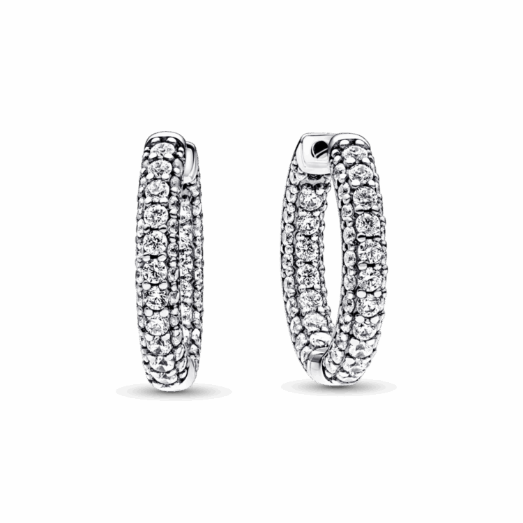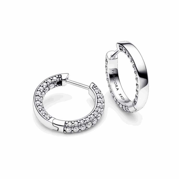 הוסיפי מגע של זוהר ללוק היומיומי שלך עם עגילי חישוק שורה-יחידה של פאווה מקולקציית Pandora Timeless. עגילי חישוק אלה עוצבו מכסף סטרלינג כאשר הצדדים הפונים קידמה בתוך החישוקים ומחוץ להם משובצים בשורה אחרת של זירקוניה קובית שקופה במורד המרכז ושורה אחת במורד כל צד, באופן הלוכד את האור מכל זווית. בגב החישוקים יש משטח פשוט מלוטש. סגנני אותם בפני עצמם או עם תכשיטי פאווה אחרים מקולקציית Timeless כדי להשיג אפקט מרבי.