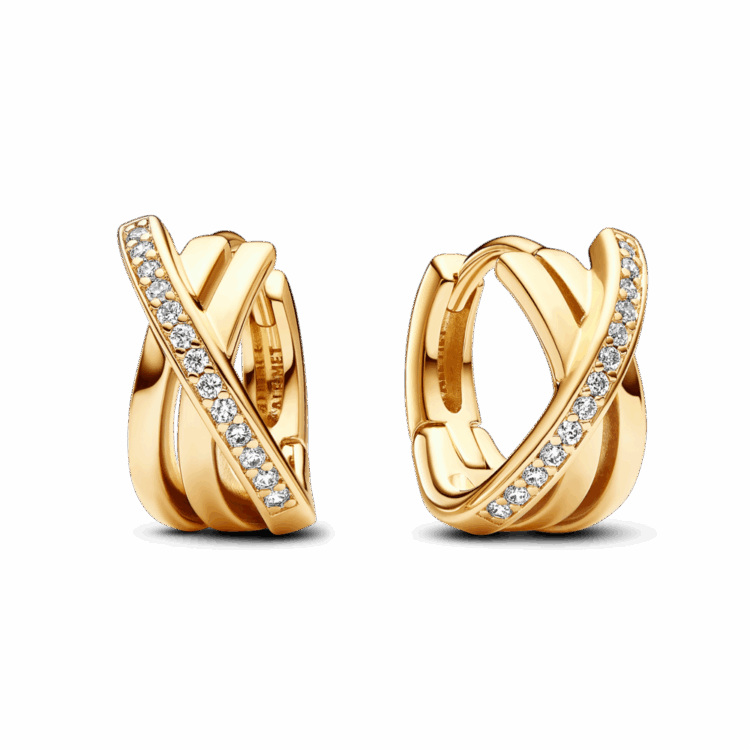 שדרי אלגנטיות מודרנית עם עגילי חישוק בציפוי זהב 14 קראט בצורת מעטפת ייחודית. העגילים מעוצבים בצורת X הנוצר על ידי רצועות מצטלבות. על גבי אחת מהרצועות משובצים זרקונים מנצנצים המוסיפים טאץ מדויק של גלואו. הדיטיילז הקטנים כמו הקווים המחורצים והלוגו החרוט של פנדורה הופכים את העגילים לשילוב מושלם של סטייל ותחכום.