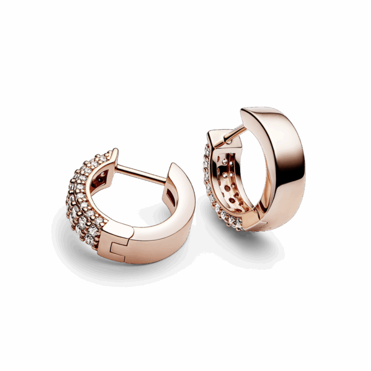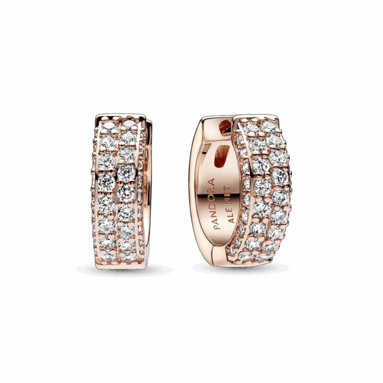 הוסיפי מגע של זוהר ללוק היומיומי שלך, עם עגילי חישוק שורה-כפולה של פאווה מקולקציית Pandora Timeless. עגילים אלה מצופים ציפוי זהב רוז 14 קאראט. הקידמה של כל חישוק מעוצבת בצורה ריבועית מעט ומשובץ בשתי שורות של זירקוניה קובית שקופה במורד האמצע ושורה אחת במורד כל צד, היוצרים בכך אפקט תלת-ממדי מרצד. הגב של כל עגיל חישוק הוא משטח מלוטש פשוט. עיצוב מתוחכם שנראה אלגנטי בפני עצמו או מסוגנן עם תכשיטי פאווה אחרים מקולקציית Timeless