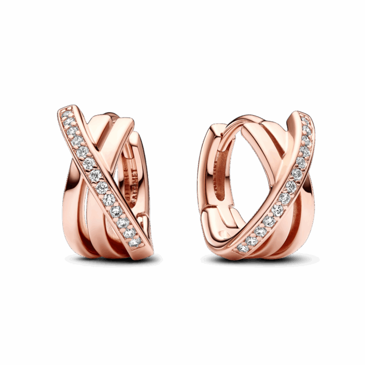 שדרי אלגנטיות מודרנית עם עגילי חישוק בציפוי זהב ורוד 14 קראט בצורת מעטפת ייחודית. העגילים מעוצבים בצורת X הנוצר על ידי רצועות מצטלבות. על גבי אחת מהרצועות משובצים זרקונים מנצנצים המוסיפים טאץ מדויק של גלואו. הדיטיילז הקטנים כמו הקווים המחורצים והלוגו החרוט של פנדורה הופכים את העגילים לשילוב מושלם של סטייל ותחכום.