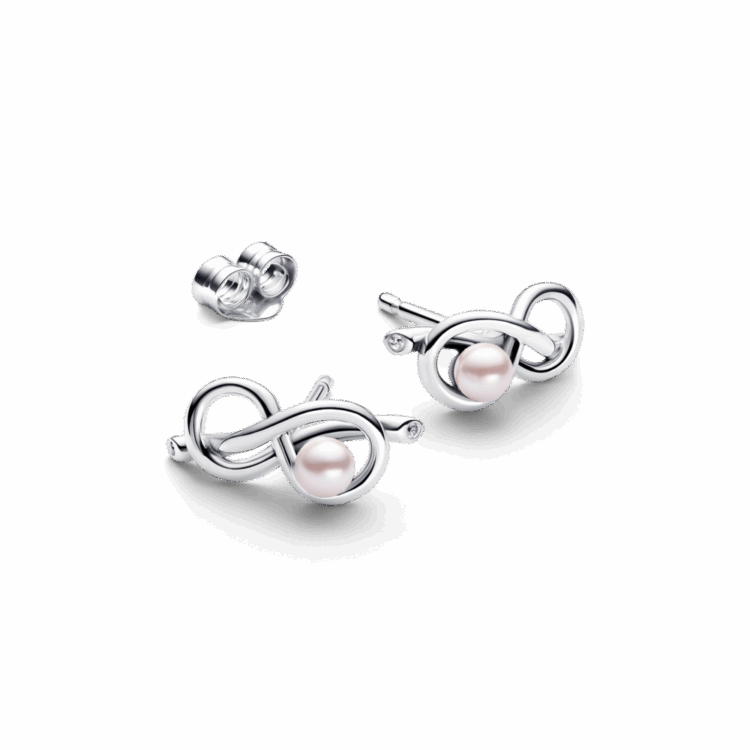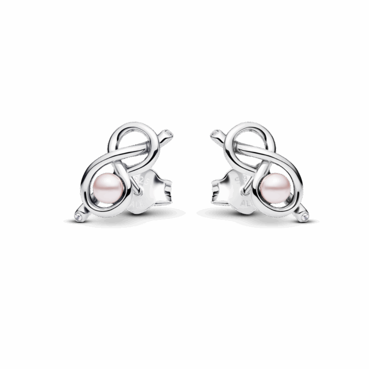 עגילי כסף סטרלינג צמודים בצורת קשר אינפיניטי עם פנינה קטנה ואלגנטית וזרקון קטנטן בקצה. כמו כל תכשיטי האינפיניטי שלנו, העגילים האלה מסמלים אהבה נצחית. שלבי אותם עם השרשרת התואמת.