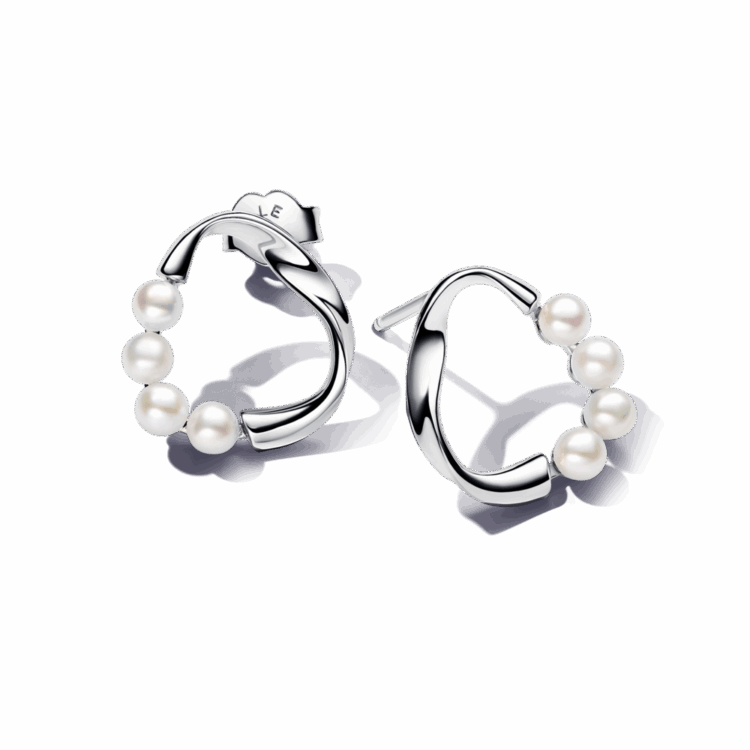 סוג חדש של קלאסיקה: עגילים צמודים עשויים כסף סטרלינג בצורת מעגל המעוצב בצורה גלית וטבעית בעובי משתנה. בכל עגיל משובצות ארבע פנינים, הפנינים מתורבתות ונוצרו במעבדה במים מתוקים, כל פנינה היא ייחודית ויכולה להיות שונה בגודלה ובצבעה.