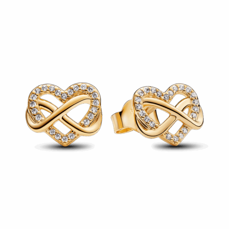 ההגדרה המדויקת לאהבה נצחית: עגילי לב צמודים בצורה פתוחה ובציפוי זהב 14 קראט עם סמל אינפיניטי ו-44 זרקונים שקופים ומנצנצים. השלימי את הלוק עם השרשרת התואמת.
