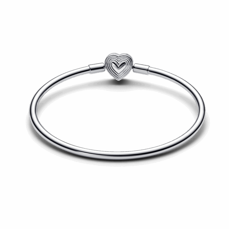 צמיד בנגל מקולקציית המומנטס האייקונית שלנו, עשוי כסף סטרלינג עם סוגר בצורת לב במראה שכבות. העיצוב הזה הוא מחווה לכוחה הגדול של האהבה. ניתן להוסיף לו בין 16 ל-18 צארמס או תליונים.