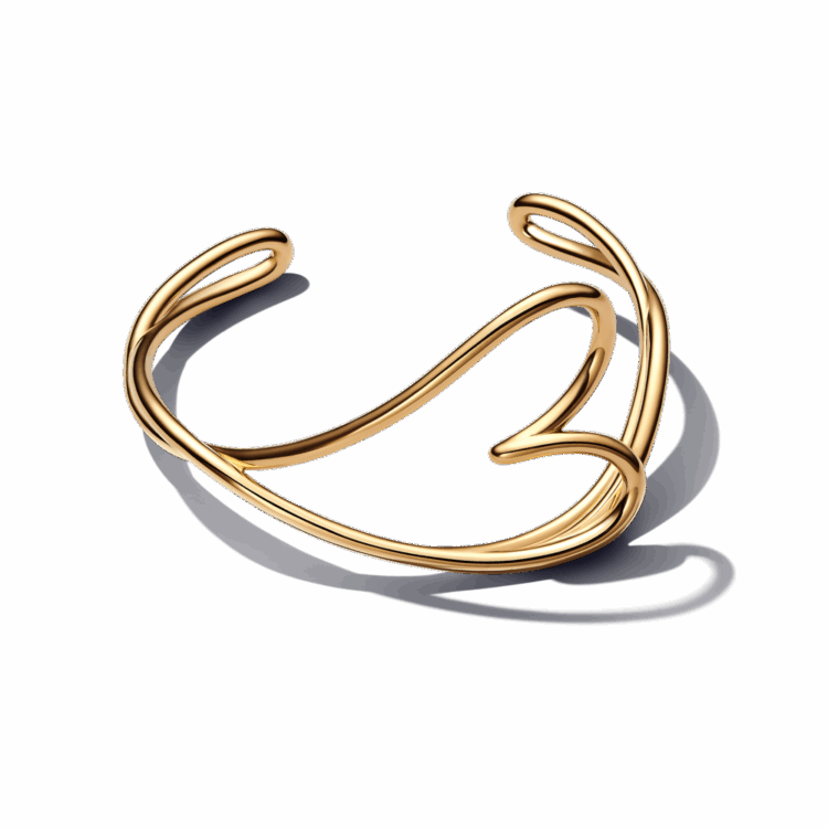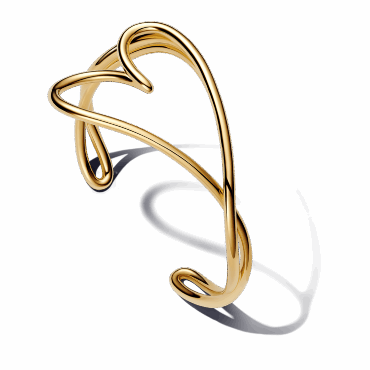 ההגדרה המדויקת לסטייטמנט: צמיד בנגל בעיצוב גלי ופתוח בציפוי זהב 14 קראט עם מוטיב גדול של לב מאויר. שלבי אותו עם העגילים והטבעות התואמים ללוק מודרני ומלא באהבה.