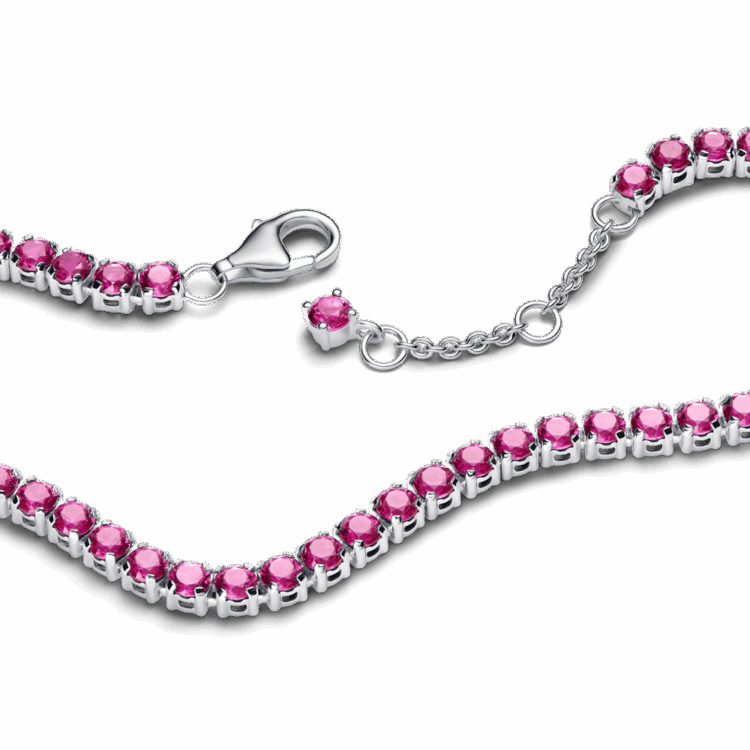 צמיד הטניס הקלאסי והאייקוני של פנדורה מקבל טוויסט צבעוני ושיקי במיוחד: כסף סטרלינג 925 בגוון קר ומדויק עם אבני קריסטל בגוון ורוד פוקסיה וסגירה מתכווננת להתאמה אישית.