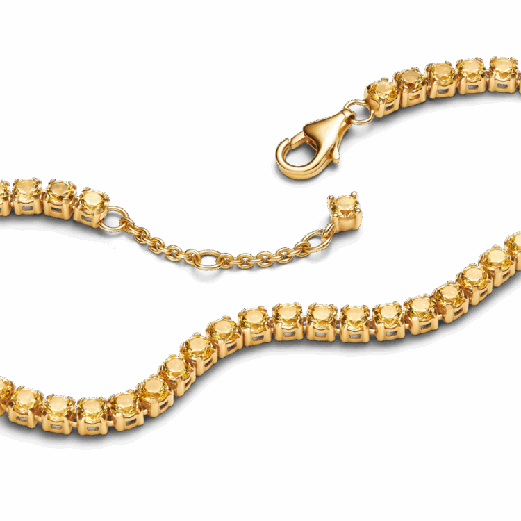 צמיד הטניס הקלאסי והאייקוני של פנדורה מקבל טוויסט צבעוני ושיקי במיוחד: ציפוי זהב 14 קראט בגוון חם ומדויק עם אבני קריסטל בצבע צהוב וסגירה מתכווננת להתאמה אישית.