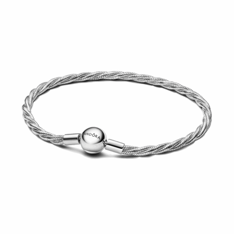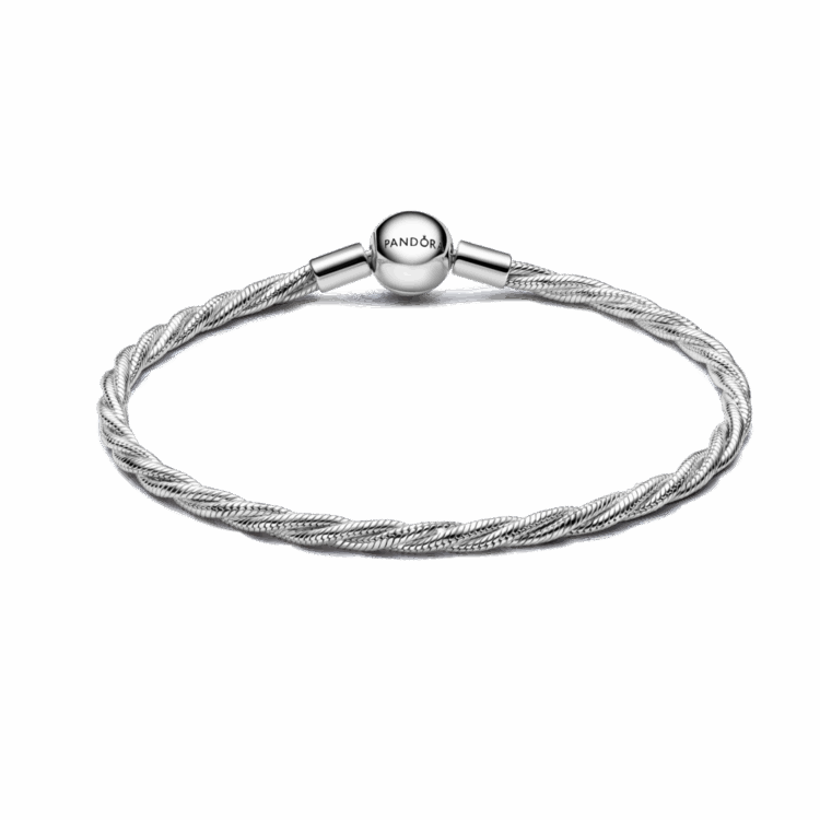צמיד מומנטס עשוי כסף סטרלינג בעיצוב מלא בטוויסט עם רצועות דקיקות השזורות זו בזו. סוגר עגול עם לוגו פנדורה משני הצדדים, ניתן להוסיף לו עד 18 צארמס או תליונים.