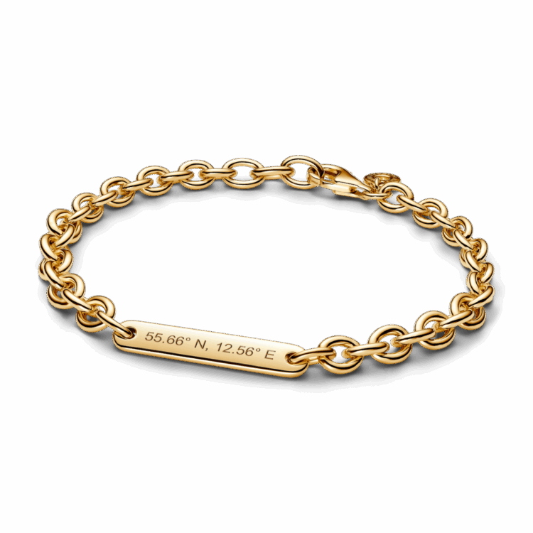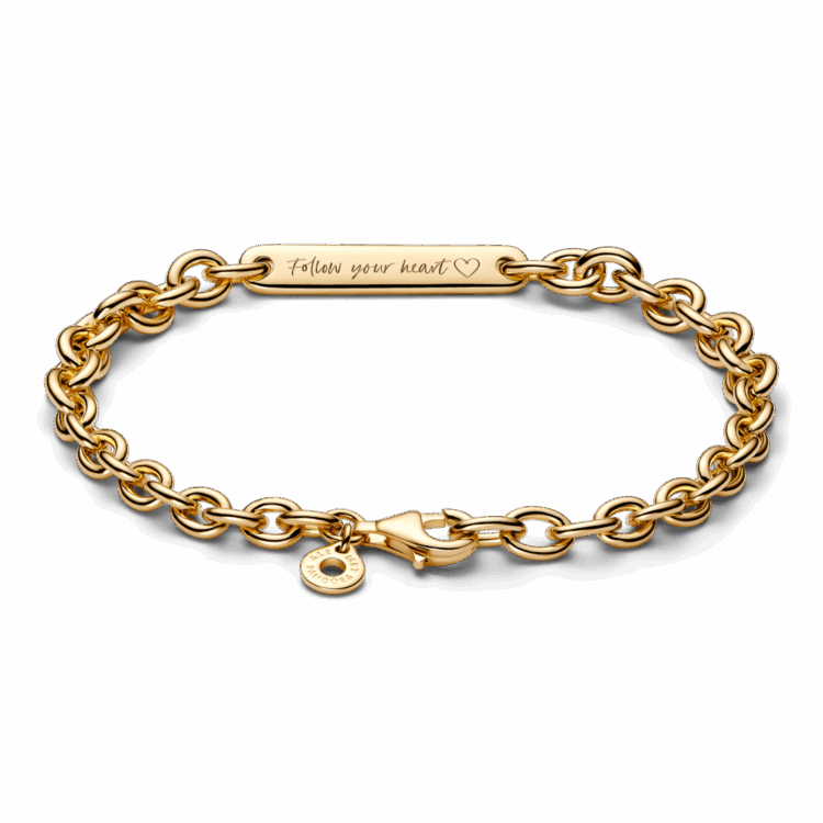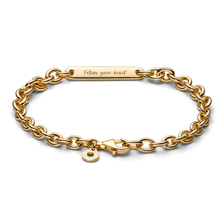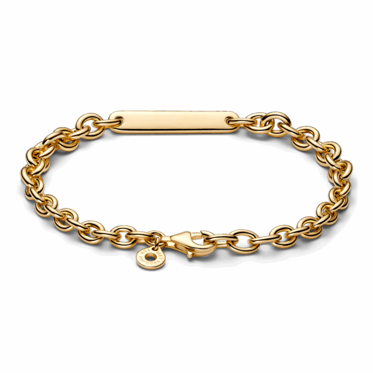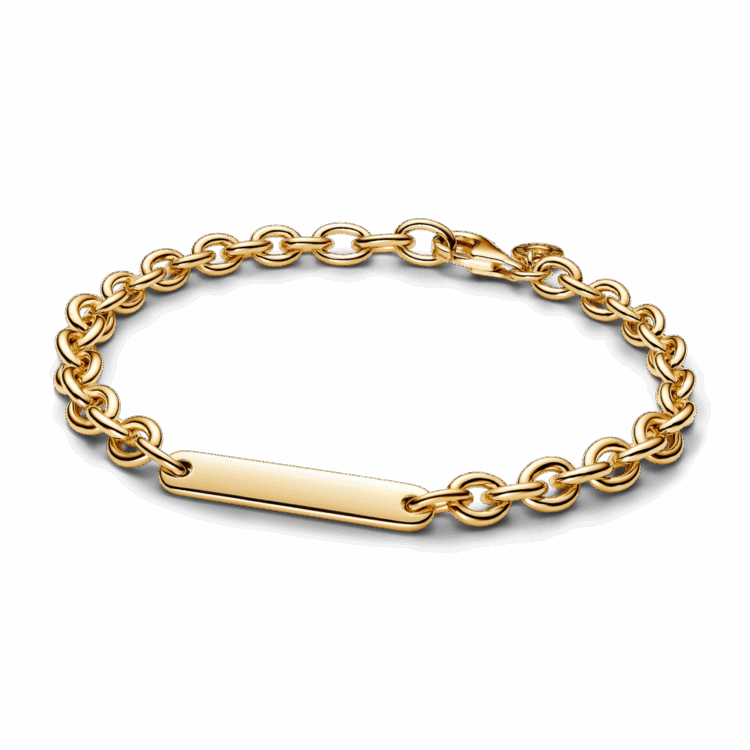 צמיד חוליות בעיצוב צאנקי מלא בסטייל, מצופה זהב 14 קראט עם דיסקית מלבנית וחלקה הניתנת לחריטה משני צדדיה. תוכלו לחרוט עליו ראשי תיבות, תאריך חשוב או כל מסר שיש לו משמעות חשובה עבורכם.