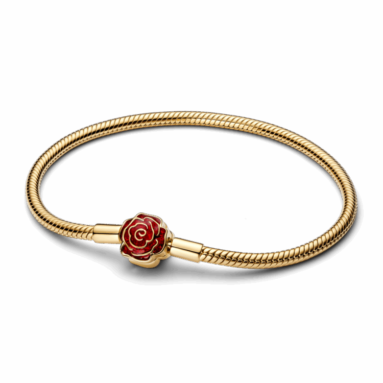 סיפור האהבה הכי אייקוני של דיסני על פרק כף היד שלך – צמיד ורד היפה והחיה בציפוי זהב 14 קראט עם ורד אדום.