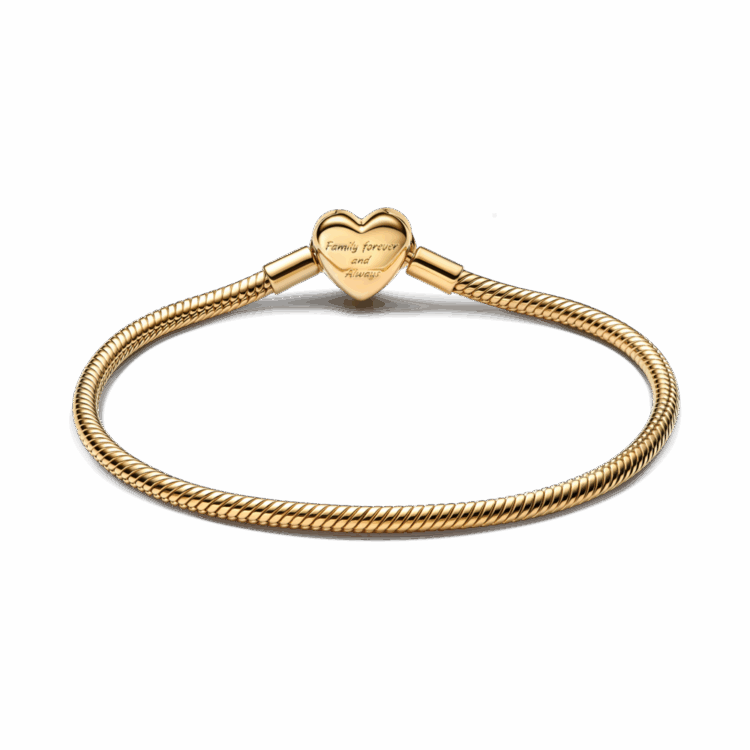 שמרי את המשפחה קרוב אלייך: צמיד מומנטס בטקסטורה מנוחשת בציפוי זהב 14 קראט עם סוגר לב אינפיניטי בשילוב אבנים נוצצות. בצד השני של הסוגר מופיע הכיתוב Family forever and always. ניתן להוסיף לצמיד עד 18 צארמס.
