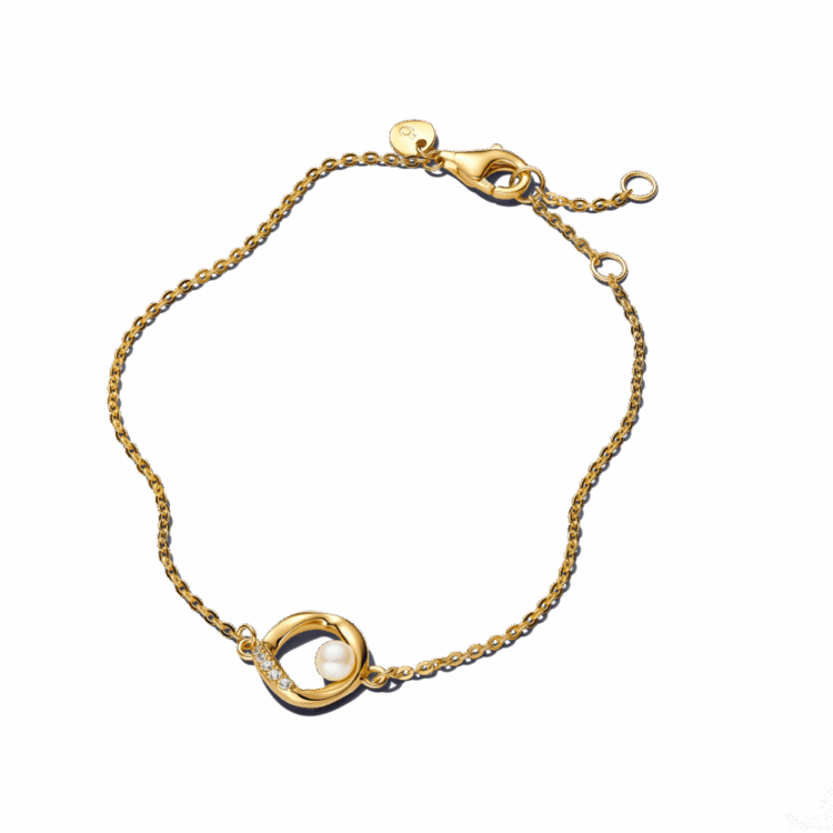 קלאסיקה עם טוויסט: צמיד מעודן בציפוי זהב 14 קראט עם חישוק בשילוב פנינה מתורבתת ושורה של זרקונים בשיבוץ פאווה. כל פנינה היא ייחודית ויכולה להיות שונה בגודלה ובצבעה. הצמיד מתכוונן לשלושה אורכים להתאמה מושלמת.
