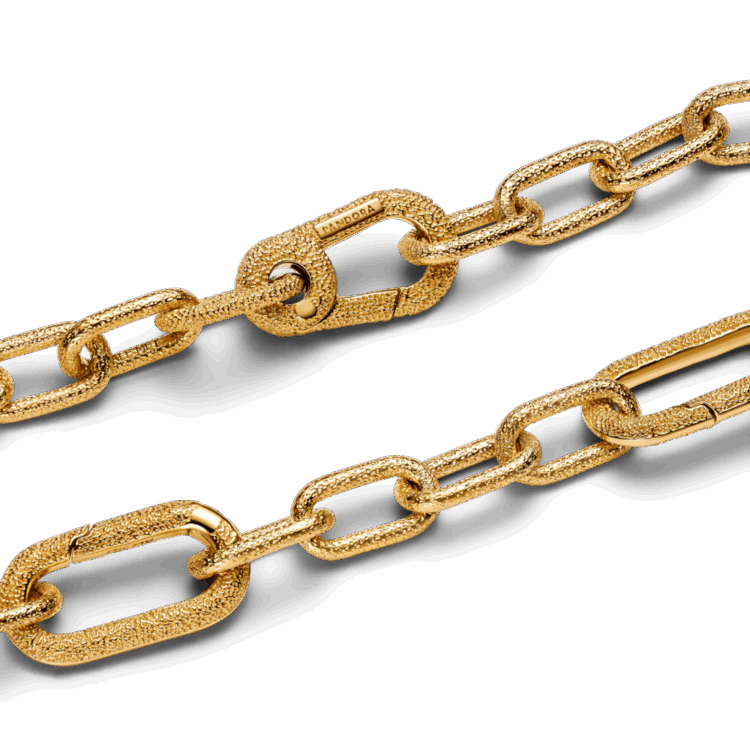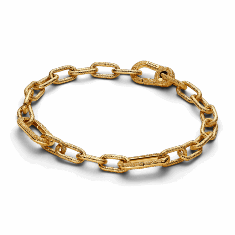 אדגי עם טאץ של גלאם: צמיד לינקים מקולקציית Pandora ME בציפוי זהב 14 קראט, עם טקסטורה ייחודית של מרקם חול. מגיע עם שתי חוליות נפתחות שעליהן ניתן לשלב תליונים ומדליונים וליצור סטייל אישי.