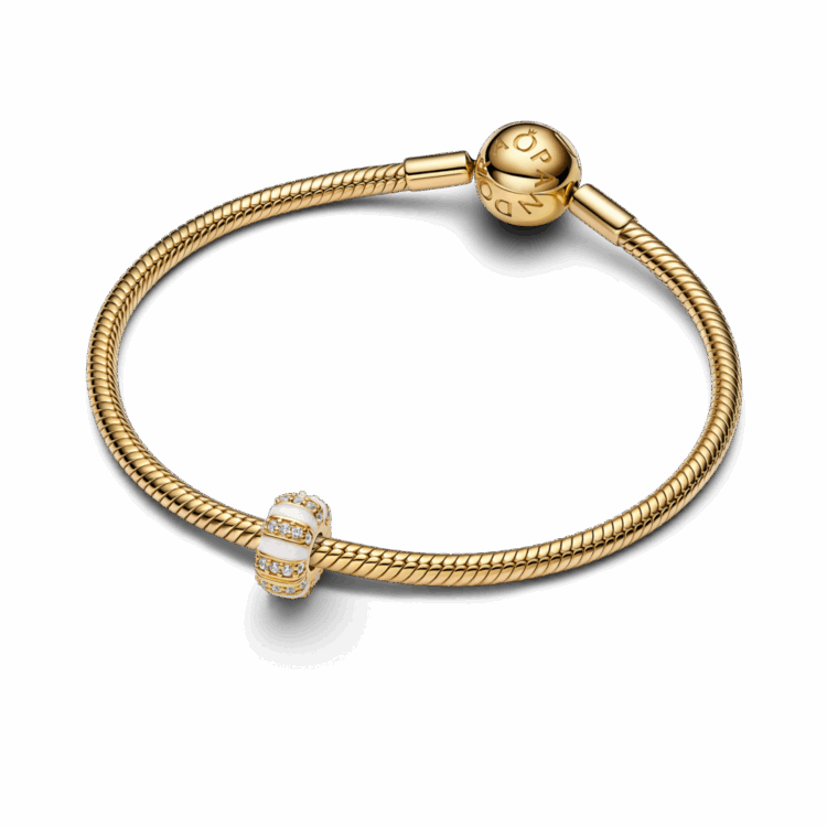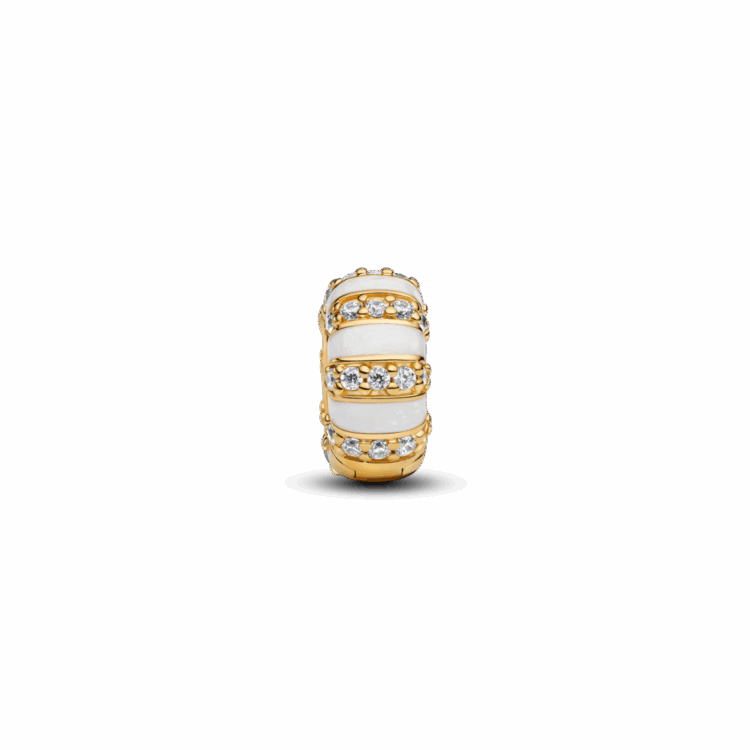 קליפס עגול בציפוי זהב 14 קראט עם צבע אמייל לבן מנצנץ ושורות זרקונים. בתוך הקליפס יש אחיזת סיליקון, המאפשרת למקם את הקליפס היכן שתרצי. הוא נוצר בהשראת מוטיבים של גמישות ויופי – המסמלים את האפשרויות הרבות שקיימות בתוכך.