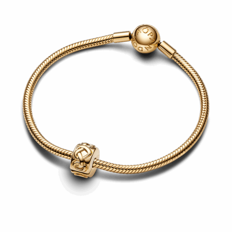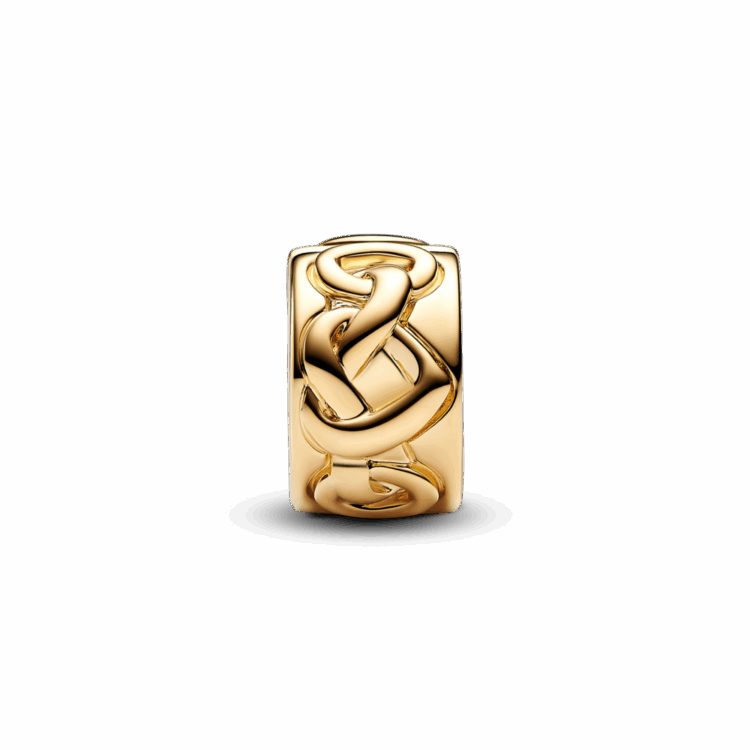 קליפס בציפוי זהב 14 קראט מקולקציית Pandora Moments המעוטר בשורת לבבות היוצרים קשר אחד עם השני. הקליפס יוסיף טאץ לבבי לאוסף שלך ויעזור לרווח את הצארמס באופן שווה. הוא אינו כולל אחיזת סיליקון ולכן יחליק במידה ולא יונח על גבי החוצצים הגבוהים.