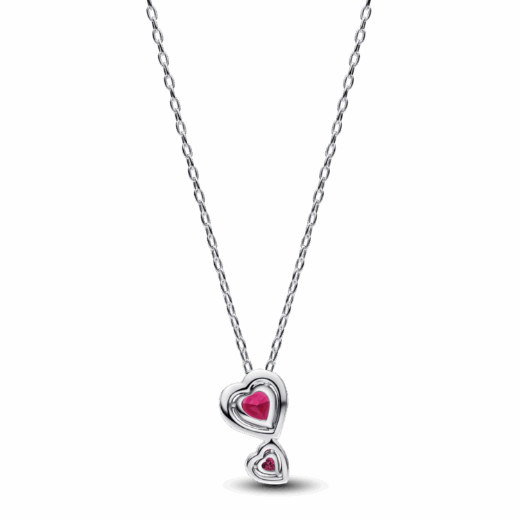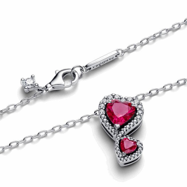 שרשרת כסף סטרלינג עם תליון הכולל שתי אבני קריסטל אדומות בצורת לבבות, המודגשים על ידי הילה של זרקונים בשיבוץ פאווה. השרשרת מתכווננת לשלושה אורכים שונים: 60 סמ, 55 סמ ו-50 סמ. ענדי אותה כדי לחגוג את הקשר עמוק של האהבה.