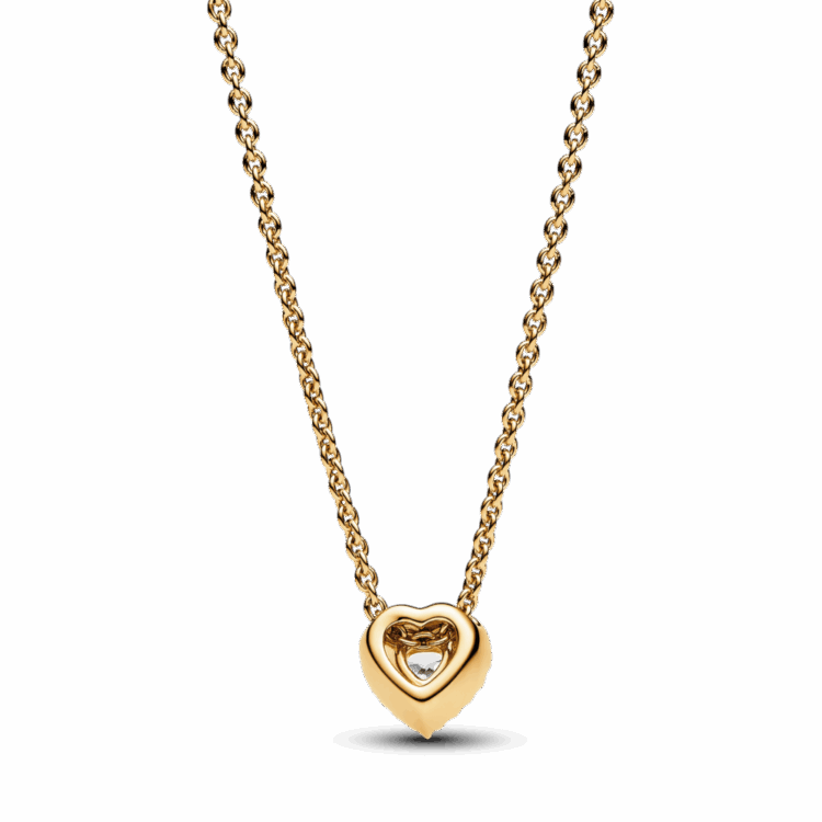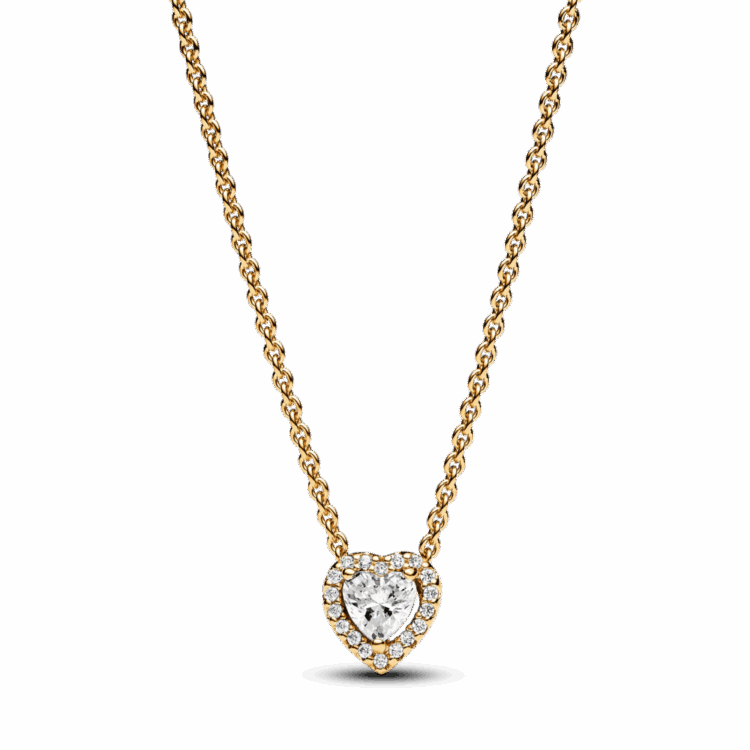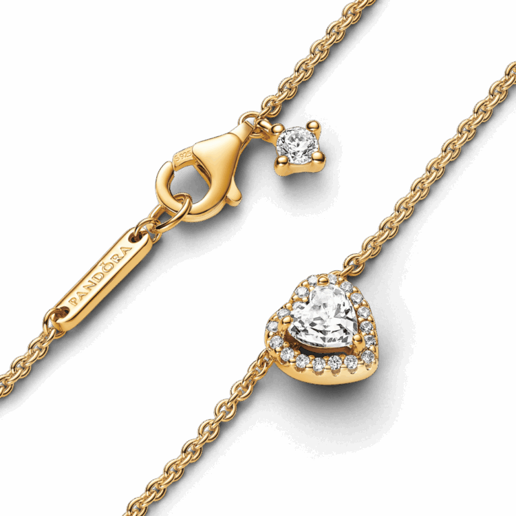 שרשרת בציפוי זהב 14 קראט המעוצבת באלמנטים קלאסיים מקולקציית Pandora Timeless. לשרשרת יש אבן מרכזית מוגבהת בצורת לב, המוקפת בהילה של זרקונים שקופים ותג מלבני ליד הסוגר עם לוגו פנדורה חרוט. תוכלי לכוון את אורך השרשרת כדי שתתאים ללוק שלך, וענדי אותה עם תכשיטים נוספים בצורת לב ללוק מלא באהבה.