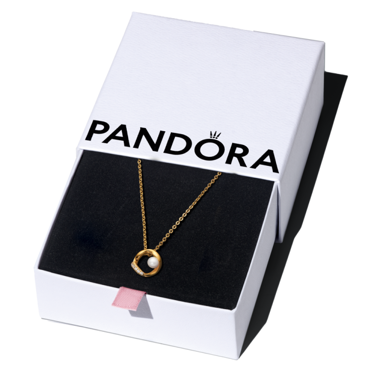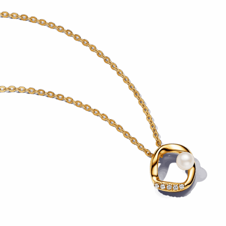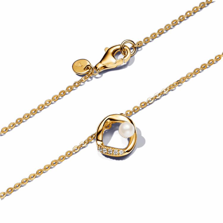 קלאסיקה עם טוויסט: שרשרת בציפוי זהב 14 קראט עם תליון חישוק בשילוב פנינה מתורבתת ושורה של זרקונים בשיבוץ פאווה. השרשרת מתכווננת והתליון נע בחופשיות ואינו ניתן להסרה. כל פנינה היא ייחודית ויכולה להיות שונה בגודלה ובצבעה.