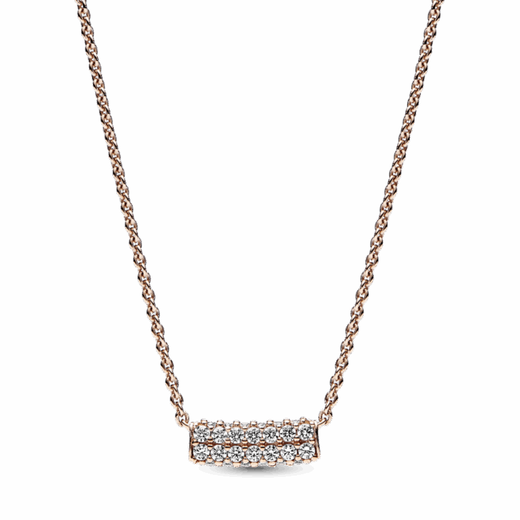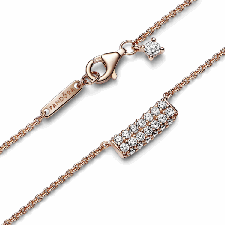 העצימי את פוטנציאל הזוהר שלך באופן מרבי עם מחרוזת קולייר פס שורה כפולה של פאווה מקולקציית Pandora Timeless. פריט גמיש זה מציג תליון פס מעוקל הצמוד לשרשרת עם גימור גאומטרי ושורה כפולה של זוהר, המשודרגת עם שורות נוספות של אבנים הפונות כלפי חוץ מכל צד. הוסיפי זוהר חמים עם גימור ציפוי זהב רוז 14 קאראט המדגיש את הזוהר התלת-ממדי. ענדי תכשיט זה, הניתן להתאמה לשני אורכים, כהצהרה בפני עצמו או כרובד עם סגנונות נוספים למען לוק נועז.