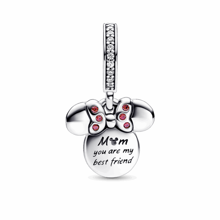 חגגי אם שהיא החברה הכי טובה שלך עם מיני מאוס מבית דיסני. צארם תליון כפול צדודית מיני מאוס מבית דיסני כולל שני דיסקים המעוצבים כצדודית ראשה האיקוני של מיני מאוס – בחזית יש צדודית מעשה תחרה עם ציפוי רוז 14 קראט המשובצת בפוואה שקוף נוצץ והגימור שלה היא הקשת האופיינית של מיני עם אבני זרקוניה קוביות אדומות. בצד האחורי נמצא תליון כסף סטרלינג עליו חרות המסר אמא את החברה הכי טובה שלי (Mum you are my best friend) עם צדודית חתוכה של מיני מאוס המייצגת את האות u במילה Mum, והצד השני מכוסה באמייל לבן זוהר. הפתעה מתוקה עבור אמא שאוהבת את דיסני, כדי להודות לה על כל הצחוק, האהבה והרגעים המיוחדים שאתן חולקות.