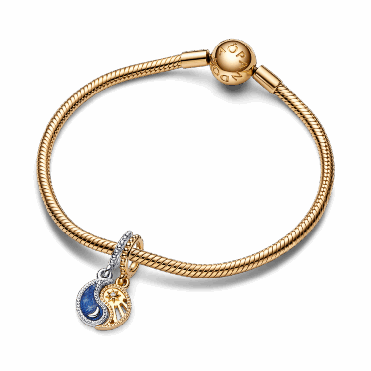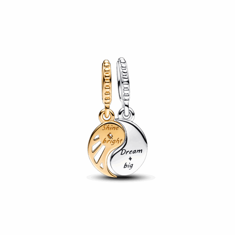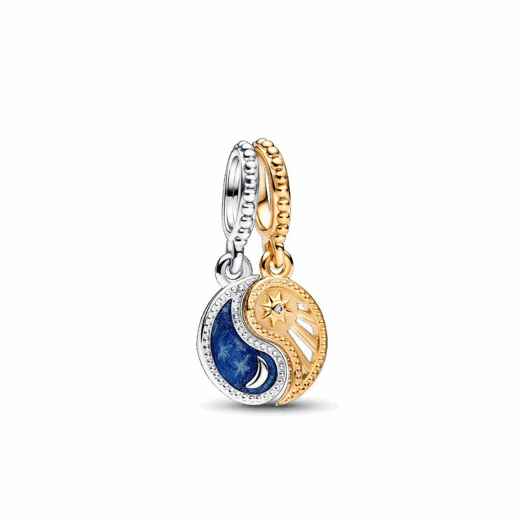 ענדי סמלים שינחו אותך ויעניקו לך השראה עם צארם תליון שמש וירח דו-גווני בר פיצול. צארם זה הניתן לשיתוף משלב סמלים עתיקים: השמש והירח והין והיאנג מסמלים יחד את האיזון, ההרמוניה והקישוריות ההדדית. תליון יאנג בציפוי זהב 14 קאראט מציג מוטיב של גזירי קרניים והחריטה האירי באור בהיר בגב, בעוד שתליון ין מכסף סטרלינג כולל מוטיב ירח סהר המוקף באמייל כחול נוצץ, כאשר המסר חלמי בגדול חרוט מאחור. שתפי אותם עם מי שמאזנת אותך או ענדי את שני החלקים כדי לסמל הרמוניה פנימית ואת יקום הפוטנציאל שבקירבך.