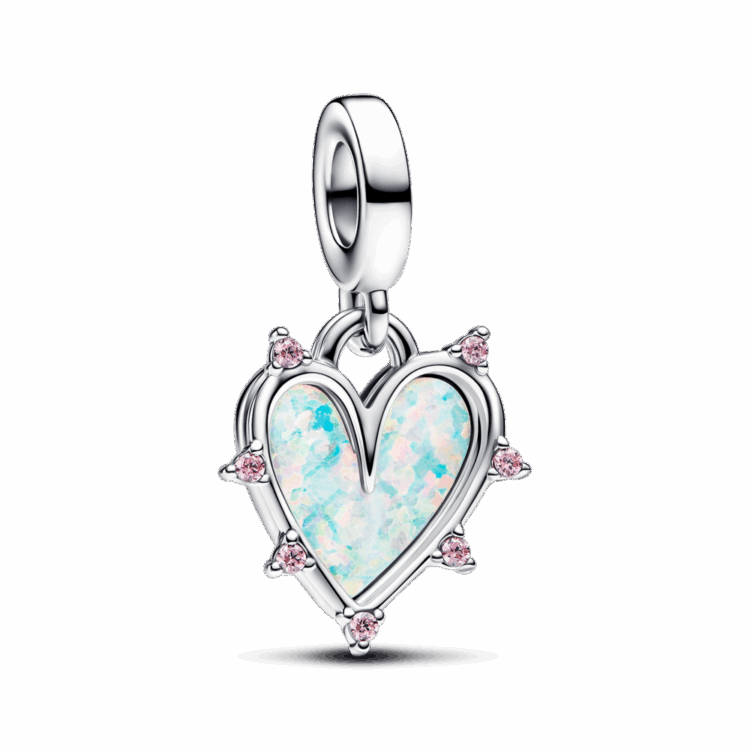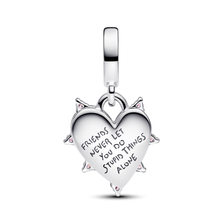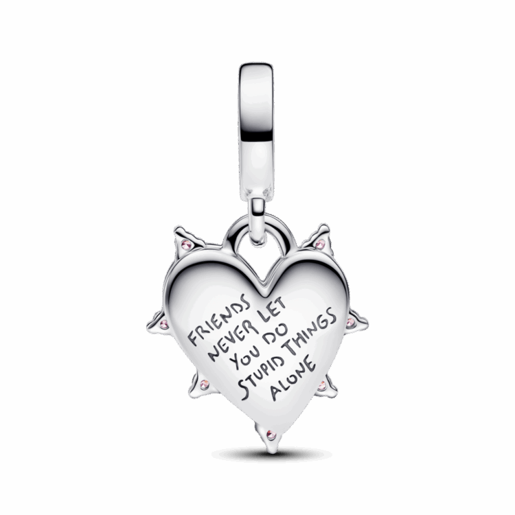 תחגגי את החברות הנצחית שלך עם תליון כפול עשוי כסף סטרלינג בצורת לב הכולל אבנים נוצצות לבנות ואבן אופל צבעונית. הוא כולל את הכיתוב: FRIENDS NEVER LET YOU DO STUPID THINGS ALONE.