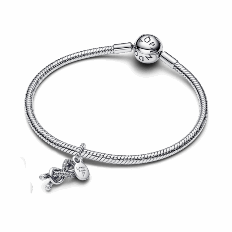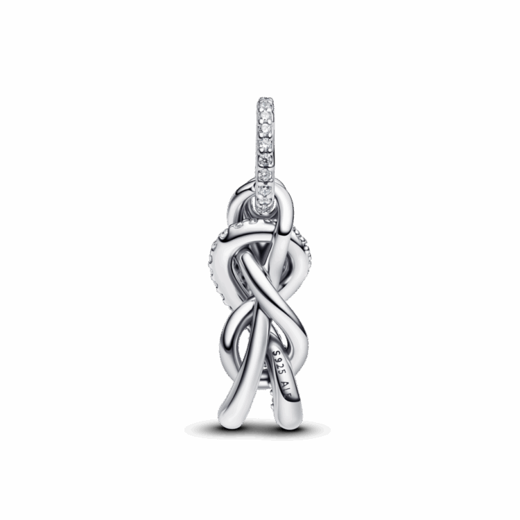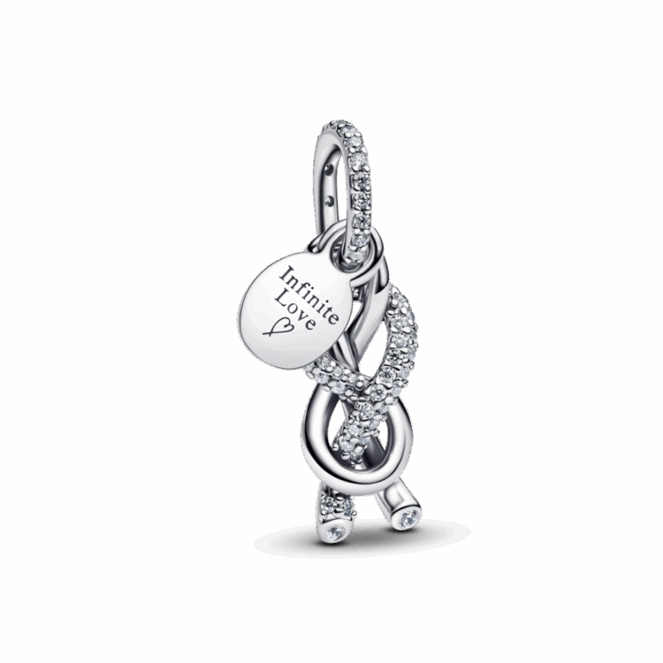 אהבה מנצחת הכל: תליון כסף סטרלינג בצורת קשר אינפיניטי עם דיסק עגול בשילוב החריטה Infinite Love. הזרקונים הנוצצים בשיבוץ פאווה מוסיפים מרקם מיוחד.