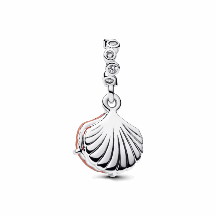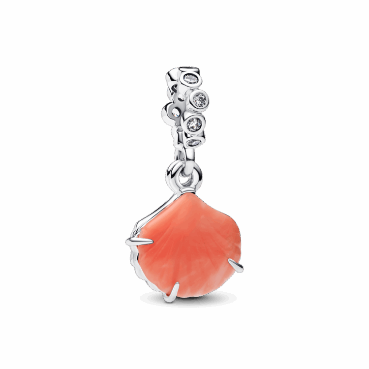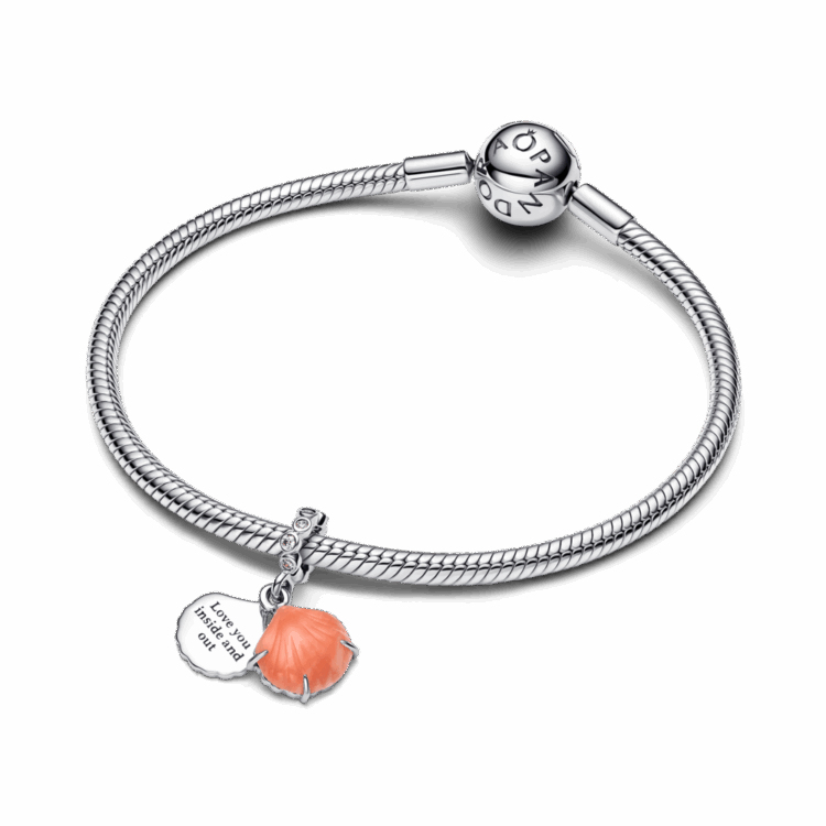 Summer Lovin: תליון כסף סטרלינג כפול בצורת צדף בצבע קורל קיצי ומרענן, עם זרקונים נוצצים בחלק העליון ודיסקית עגולה בשילוב הכיתוב המרגש “Love you inside and out”.