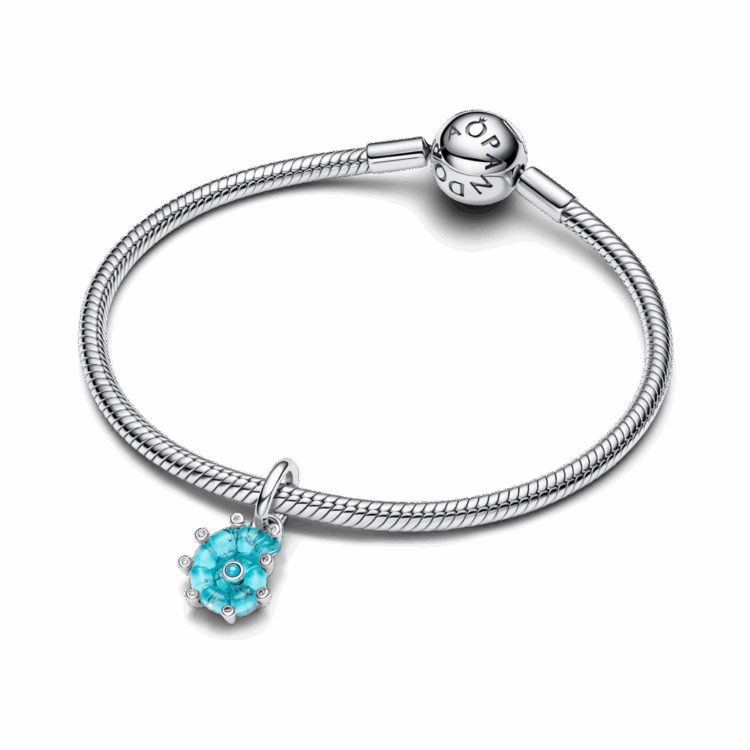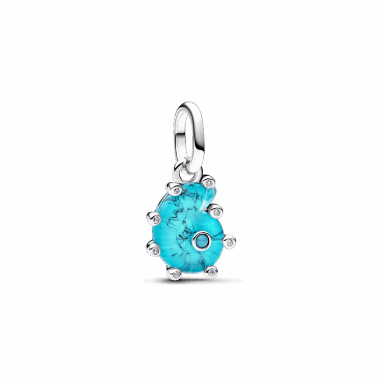 מוכנה לצלול לעומקים חדשים של שיק? תליון כסף סטרלינג בצורת קונכיה מזכוכית מוראנו בצבע טורקיז עם אבן קריסטל כחולה וזרקונים שקופים נוצצים. צרפי אותו לצמיד המומנטס שלך עם צארמס קיציים נוספים.