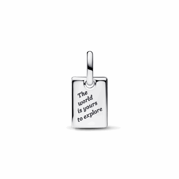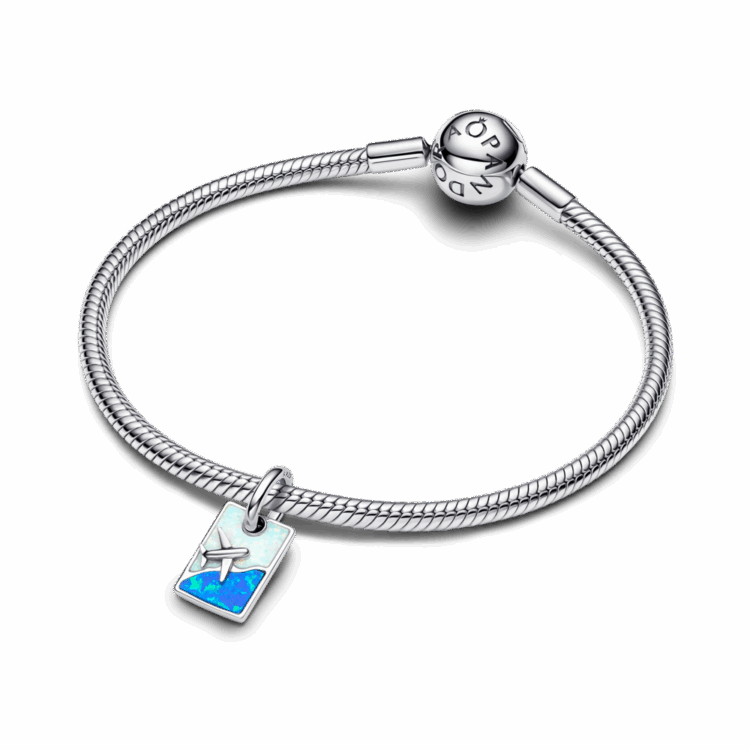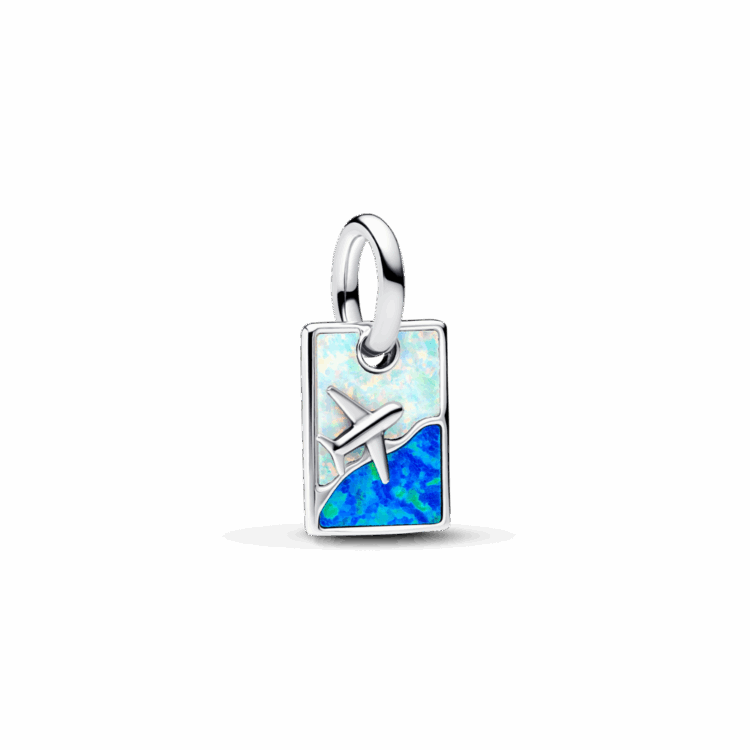 סטייל שרואים ממרחקים: תליון כסף סטרלינג מלבני עשוי אבן אופל צבעונית ומנצנצת עם דוגמת מטוס. בחלק האחורי מופיע הכיתוב The world is yours to explore. זו תהיה המתנה המושלמת עבור מישהי יקרה שטסה לטיול ארוך.